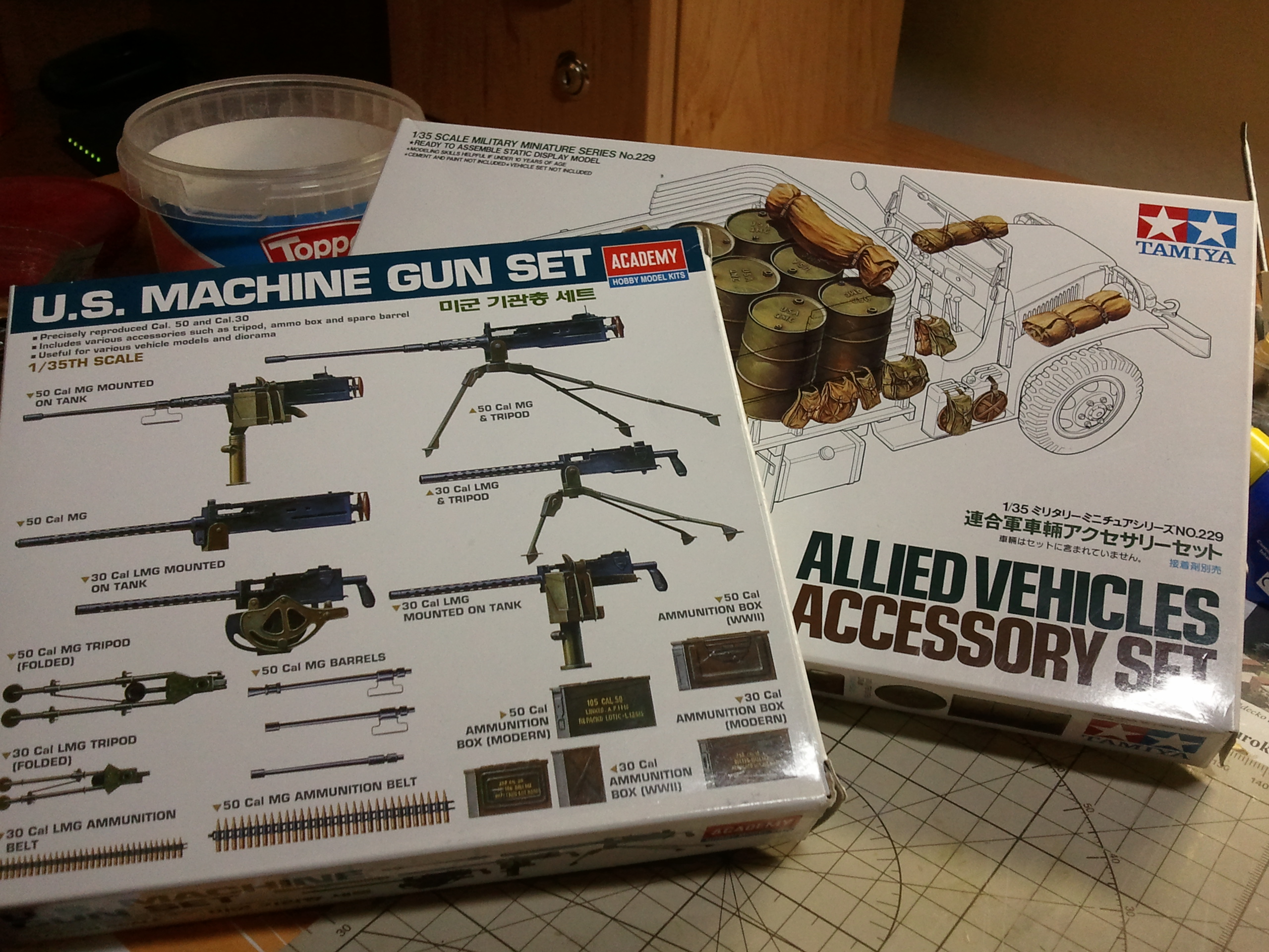 tak zase malý posun, co jsem dnes udělal...koupil jsem sety od Tamiye a Academy, prvni je prislusenství pro spojenecke jednotky II.sv., protoze jsem potreboval na Sherma, kanystry. Ty ze stavebnice byly sice izraelske, ale udelane vcetne drzaku nalisovanych na kanystrech. Ja tam budu davat drzaky z leptu, takze by to v tom vypadalo docela blbe a odbrusovat vsechny kanystry, tmelit atd....to fakt ne. Takze jsem zakoupil set, kde jou kanystry, batohy, celty, sudy atd.. Z tohoto setu jeste vyuziji prave ty batohy a nakombinuji je s batohy ze stavbnice.Dale ma koupeny zbranovy set od Academy pro kaliber 50a 30, ktere take budou na Shermovi, 50 bude na vezi a 30, pouze hlaven, bude couhat vedle dela, v delovem krytu vlevo po smeru jizdy.Zbrane jsou z x dilu a jsou velice propracovane, takze kdo nehce kupovat kovovou 50, tak toto je ideální, je to včetně zásobníků, pasu se naboji a take ruznych lafet a drzaku, zalezi zda jsou montovane na vozidlu ci volne.Kanystry vypadaji super, krasne detailni, musim je hodit do surfu, pak cerna ci black tire barva a drybrush. Sice je toho malo, ale nestiham ted...o:) ale ja se polepsim..o:)