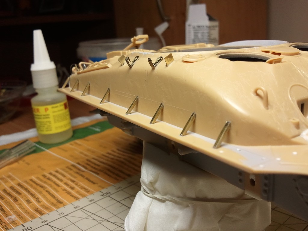 Takže, jak je u mě známo, opět malý posun v lepení. Plastové držáky blatníků vypadaly humpolácky, tak jsem je nahradil plechovými od Edy. Nohejbal, slepil, nalepi a začistil. Takže mámem toto zkrku.A můžeme se vrhnout an ten podvozek - vozíky s koly. Pásy stále od AFV nedorazili, hodl má asi Rosta hodně práce..o:) Přikládám foto. A jdu si už lehnout....stávám v pul seste