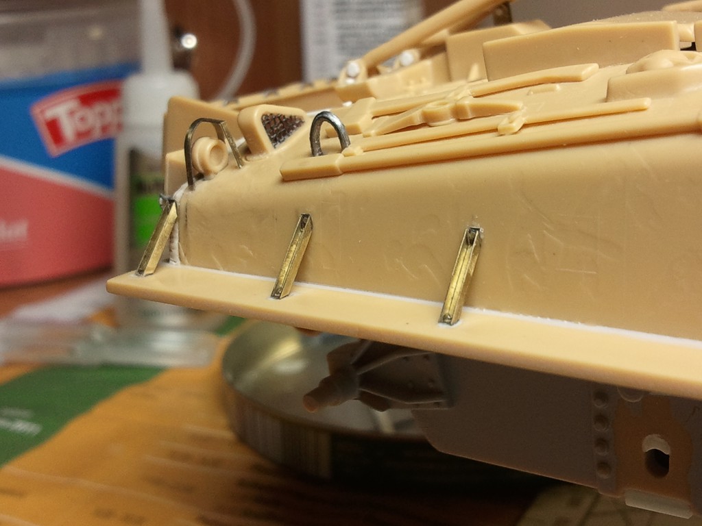 Takže další progres. Dnes jsem naohýbal a slepil z leptů držáky blatníků k vaně, dále jsem udělal držáky náhradních kol, ochrany peryskopů, ochrany světel a připravil hlaveň CAL 3O, která přijde do věže na levou stranu po směru jízdy tanku. Také jsem udělal kontrolní nástřik horní ch stran blatníku surfem, abych zjsitil, co bude a nebude vidět po tmelení plastem a sekundakem děr, které byli na původní plastové držáky blatníku. Jak vidíte, budu muset sem tam něco přetahnout jemně 5OO surfem či tmelem a jeste zbrousit. Pak už mám udělané a nalepené a začistěno ty dištance, kvůli zvednuti cca o 1,5 mm vozíků s koly, protože puvodně to bylo moc utopené,takže to bylo potřeba zvednout. Teď už je to v pořádku. A jako poslední jsem stříknul surfem podběhy blatníků, ktere jsem take tmelil a brousil. Přikládám foto.