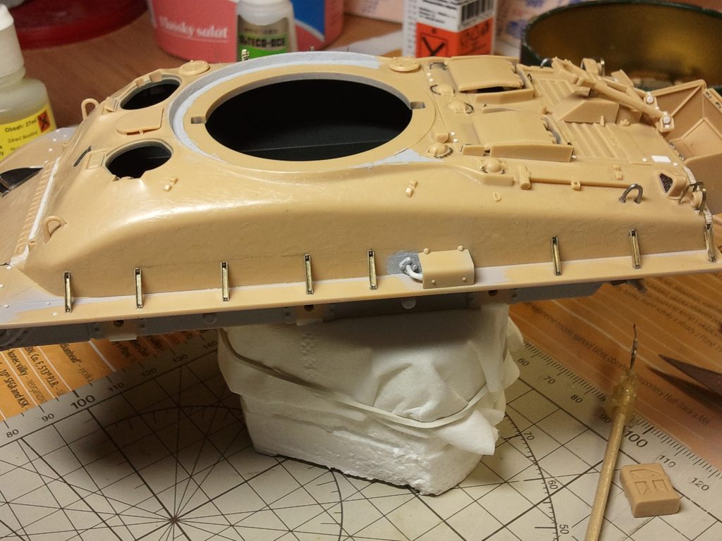 Díky Tome, snazim se..o:) ten pancir je v realu v pohode,,,fotky to hodne vytahly.,,jinak ohledne barvym uz mam jasno,,jen jsem to sem dal...aby to bylo kompletni do tedka,,,,mozna to nekomu pomuze..o:) jj je to mix tamek, odstinem do piskove, na kterou pak prijde jeste zeleny filtr, to mi vse poradil Braňo, z MF. Hodně se vyzná v izraelské technice....ted stale cekam na pasy, budu lepit drzaky blatniku z leptu a jine kraviny na horni cast tanku a tez musim zalakovat kola, udelat jim wash, hodit to na voziky a prilpit ke spodni vane..jeste je prace dost,,se stim seru, ja vim,,ale jsem uz takovy, mam rad detaily, co delaji model modelem..o:))