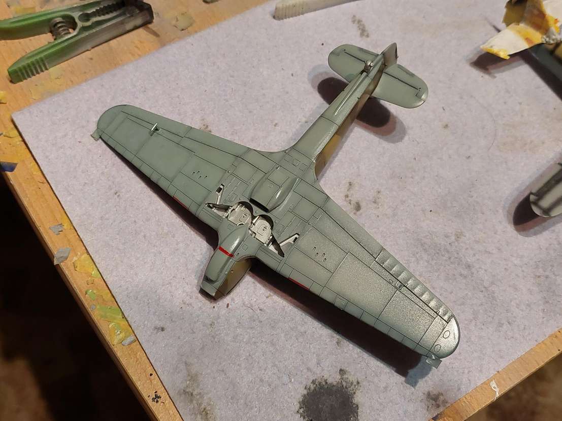 V barvě. Vím, nástřik takto působí hrubě, trochu opravdu je ale po obtiscích a laku to chci trochu srazit jemným smirkem. Základ jsou odstíny agamy. Co je v návodu dané jako "fresh" jsou odstíny MRP. Levé křídlo má být "faded", použity agamy zesvětlené odstínem spodku. Na spodku je agamácká RLM76, ošustělé levé křídlo je tamka XF23 lehce přefouknutá RLM76.
