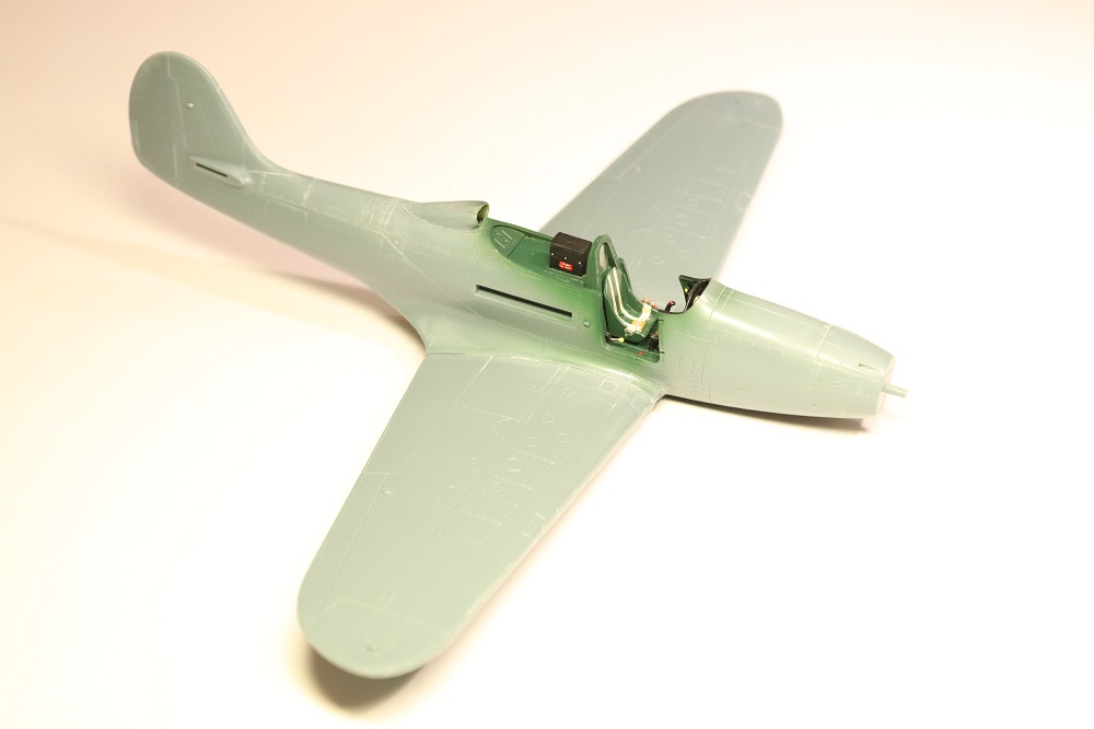 Ten odstín kokpitu mi vyšel podobně, vycházel jsem z brcalove zelené, co jsem dával na vršek Zera, kterou jsem natónoval zinkochromatem.