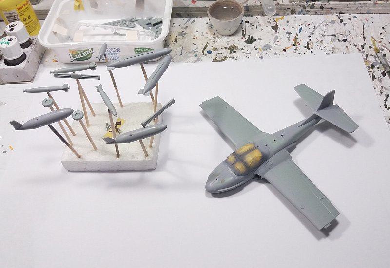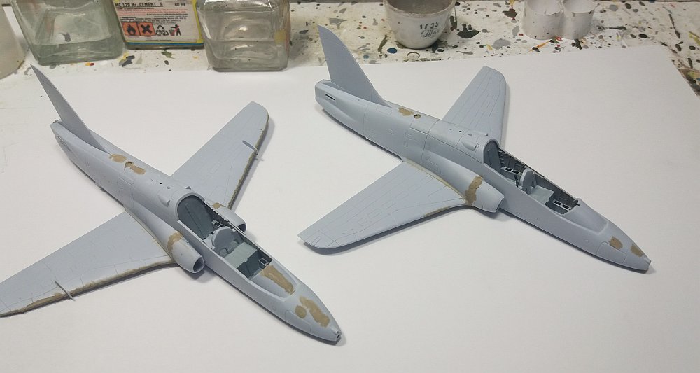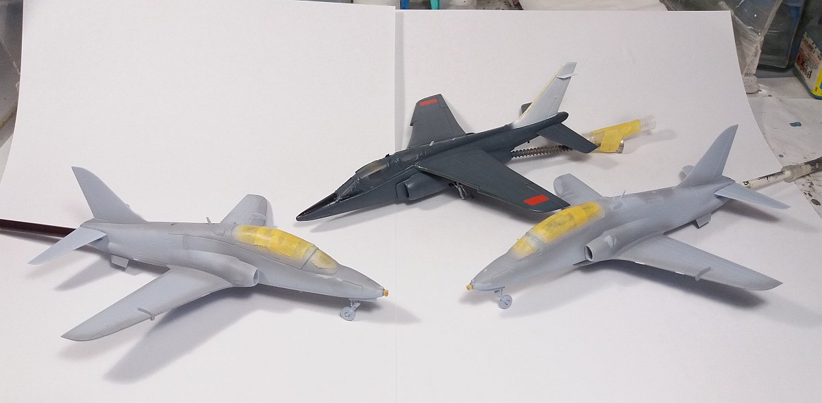 Dále jsem se zabýval již dávno rozdělanými Hawky od Airfixu a dotáhl jsem je do stavu před začátkem kamufláže. Dalo to trochu zabrat, zejména čiré díly nejsou kdovíjak kvalitní a kabinku jdem ladil, leštil sundával na 3x.