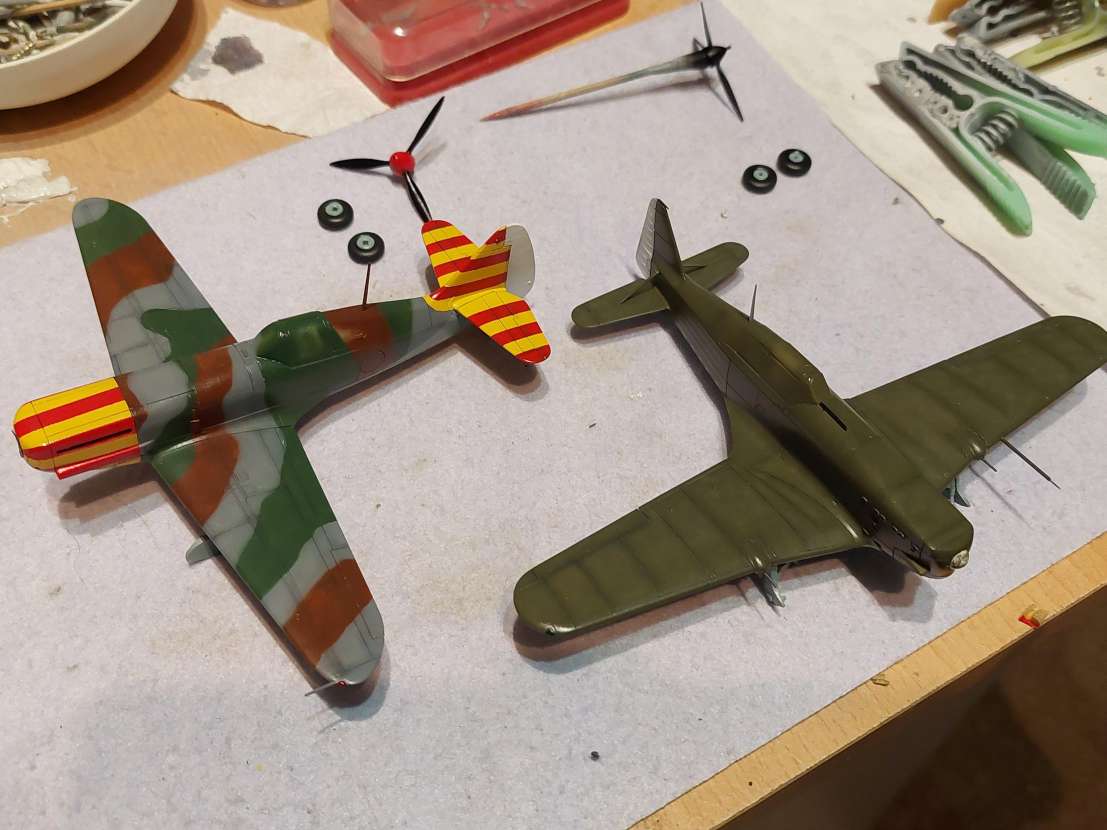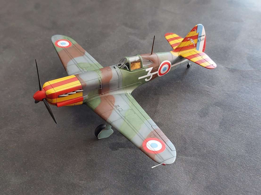 Nebaví mě wash, tak jsem se z Hurricana vrátil sem. Laborovalo se nad odstíny. U Morana jsem vzal návod H2000 a použil britskou zelenou, no na stroj z Alžírska se hodilo něco trochu světlejšího. Ale nějak mi to nešlo do kombinace se zbytkem barev pro trojbarevku. Takže u D.520 jsem dlouho uvažoval, potřebný mix který udává Dora u MB.152 jsem doma neměl. Vzpomněl jsem si na lihovou agamu, "autentický" odstíny pro Francii. No sotva jsem nafoukal první kamuflážní pole, letěla barva zpátky do lahvičky, něco tak jedovatýho bych použil možná tak na bronzovou střechu kostela nebo vyblitou Mi-4 z Vyškova. Tak jsem nakonec vzal něco zelenějšího od gunze a výsledek je na fotce. Je to takové asi taky mimo, takové živé, ale už to nechám.