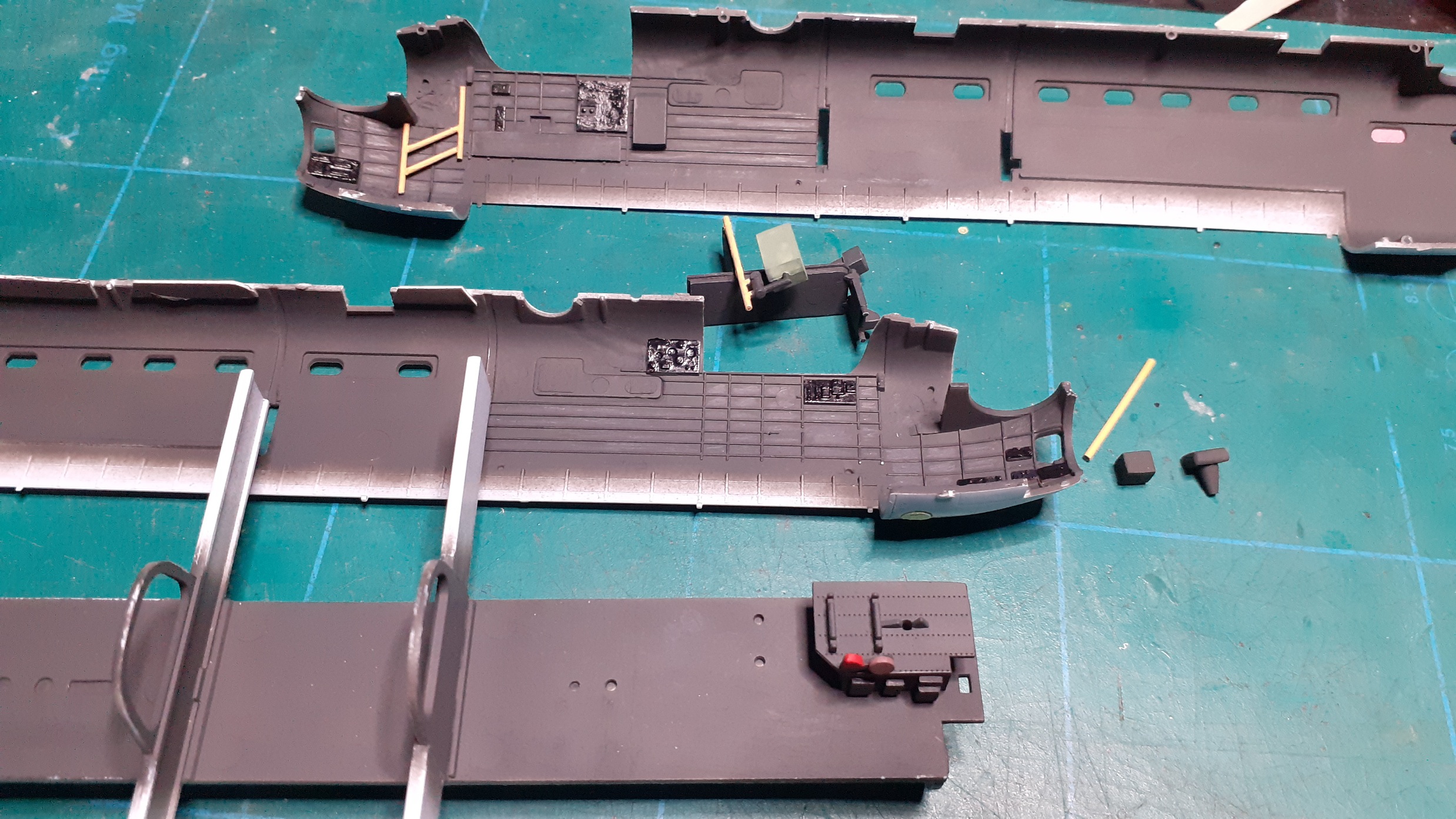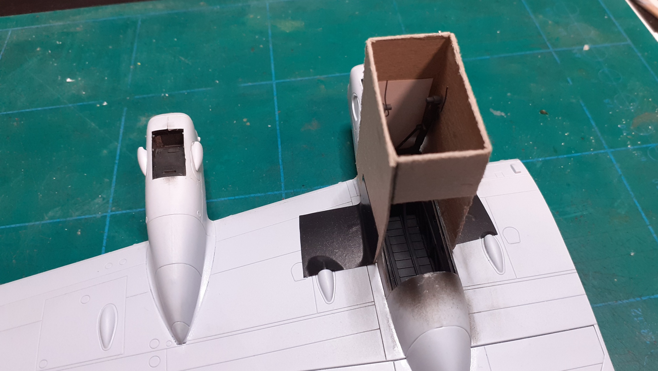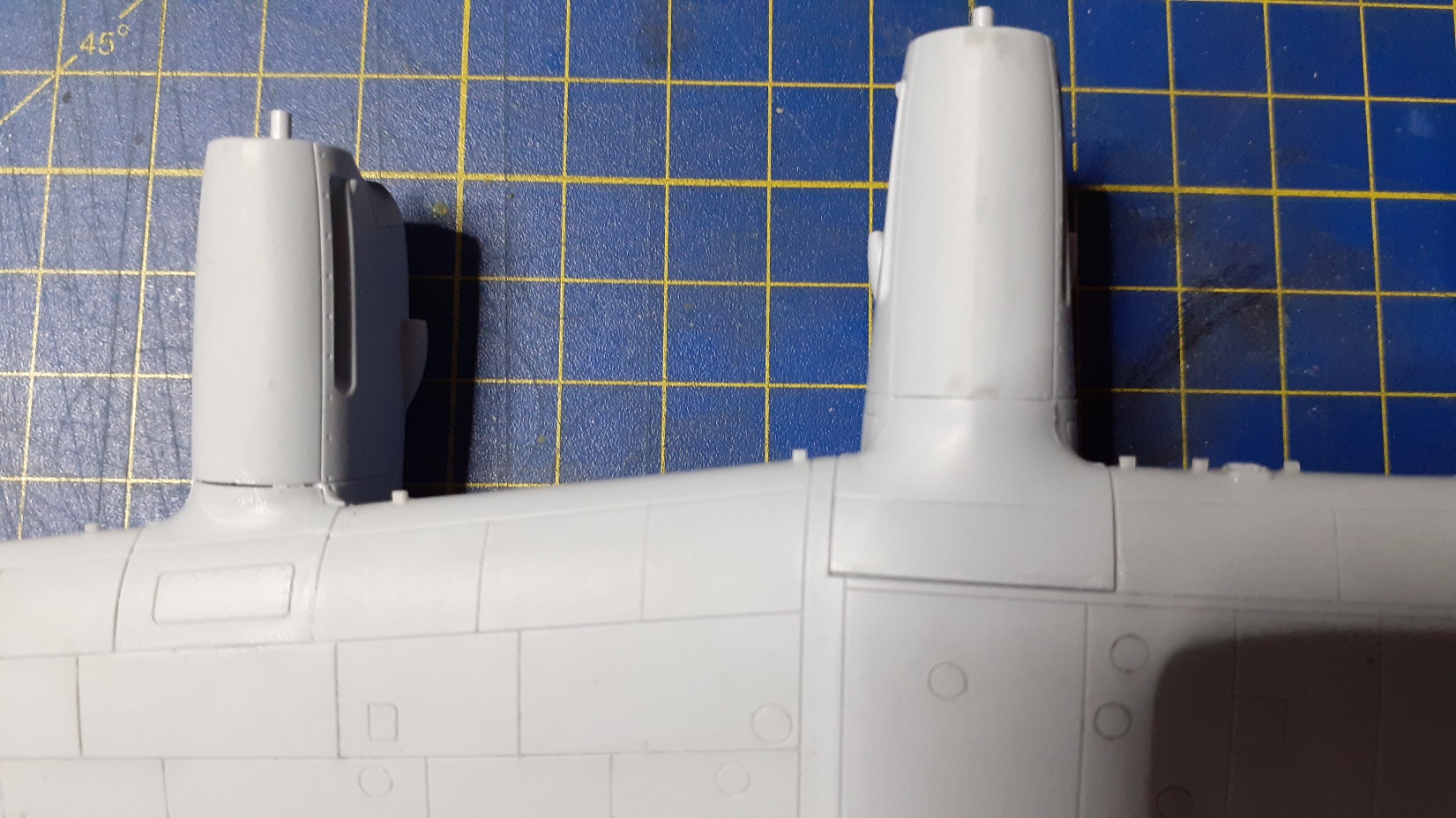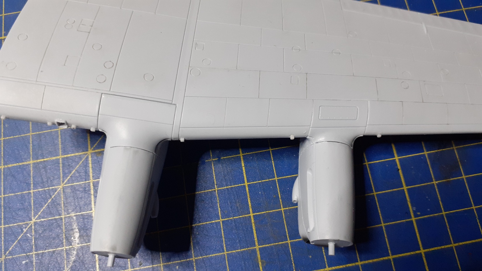 Dostal som sa k pripojeniu motorových gondol ku krídlu... Musím konštatovať, že tí, ktorí upozorňovali na veľmi zlé pasovanie stavebnice v tejto časti, tak mali žiaľ pravdu. Skutočne to veľmi zle sedí. Hlavne tie nezmyseľné panely prechodov na nábežnej hrane do motorových krytov zhora. Je to zbytočne prekombinované a prekomplikované. Po nasadení týchto krytov vzniknú veľké ryhy medzi dielmi, právve v mieste, kde by má byť rytie. Zároveň to nesedí ani výškovo. Skúšam použiť poliesterový, dvojzložkový tmel. Keďže niekde však po narytí tento vypadáva, tak ešte následne pretmelujem klasickým jednozložkovým, rozriedeným acetónom a nanášaným štetcom. Po riadnom vytvrdnutí skúsim opatrne rytie zase pretiahnuť žiletkovou pílkou. Vyzerá, že toto bude najproblémovejšia časť stavby. Navyše pri vnútorných gondolách musím najprv vlepiť zhora(!) podvozkové nohy a až potom zavrieť spomenutým panelom ten prechod a na koniec celý ten postup s tmelením. Bojím sa, aby som pri tom celom neulomil tie podvozkové nohy. To ich nezmyseľné vlepovanie zhora je riadne a zbytočne prekombinované.