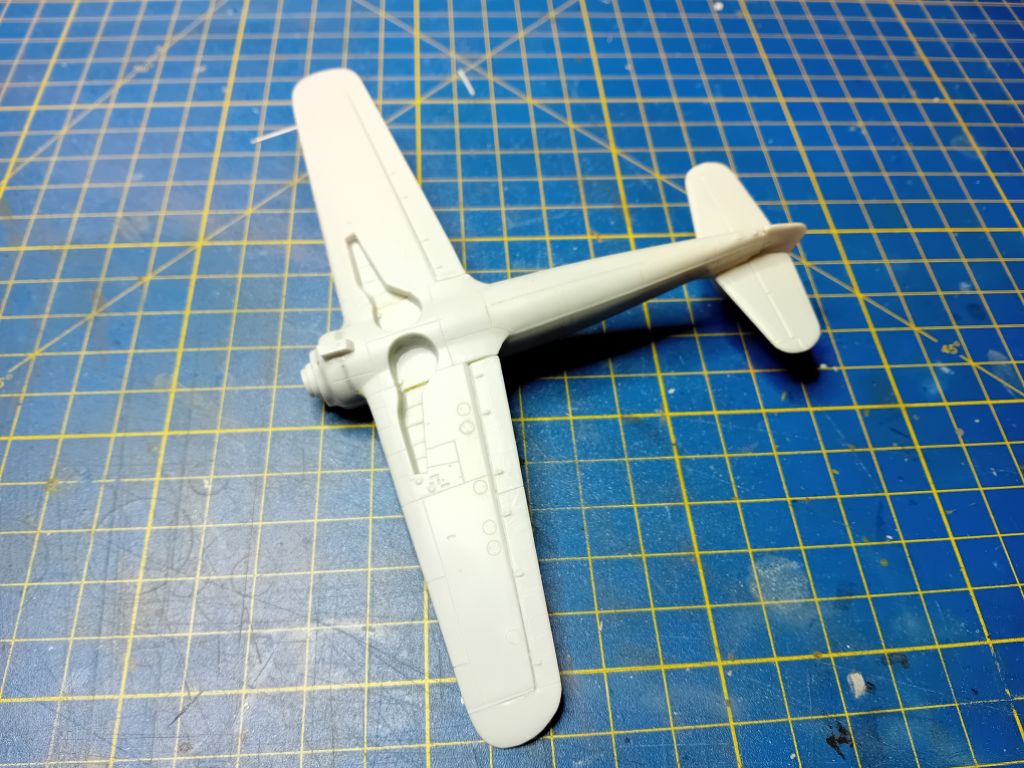 Celé som to vytmelil, vybrúsil a obnovil rytie. Napojenie krídla k trupu pri nábežke ešte bude potrebovať tmelenie, ale to pôjde.