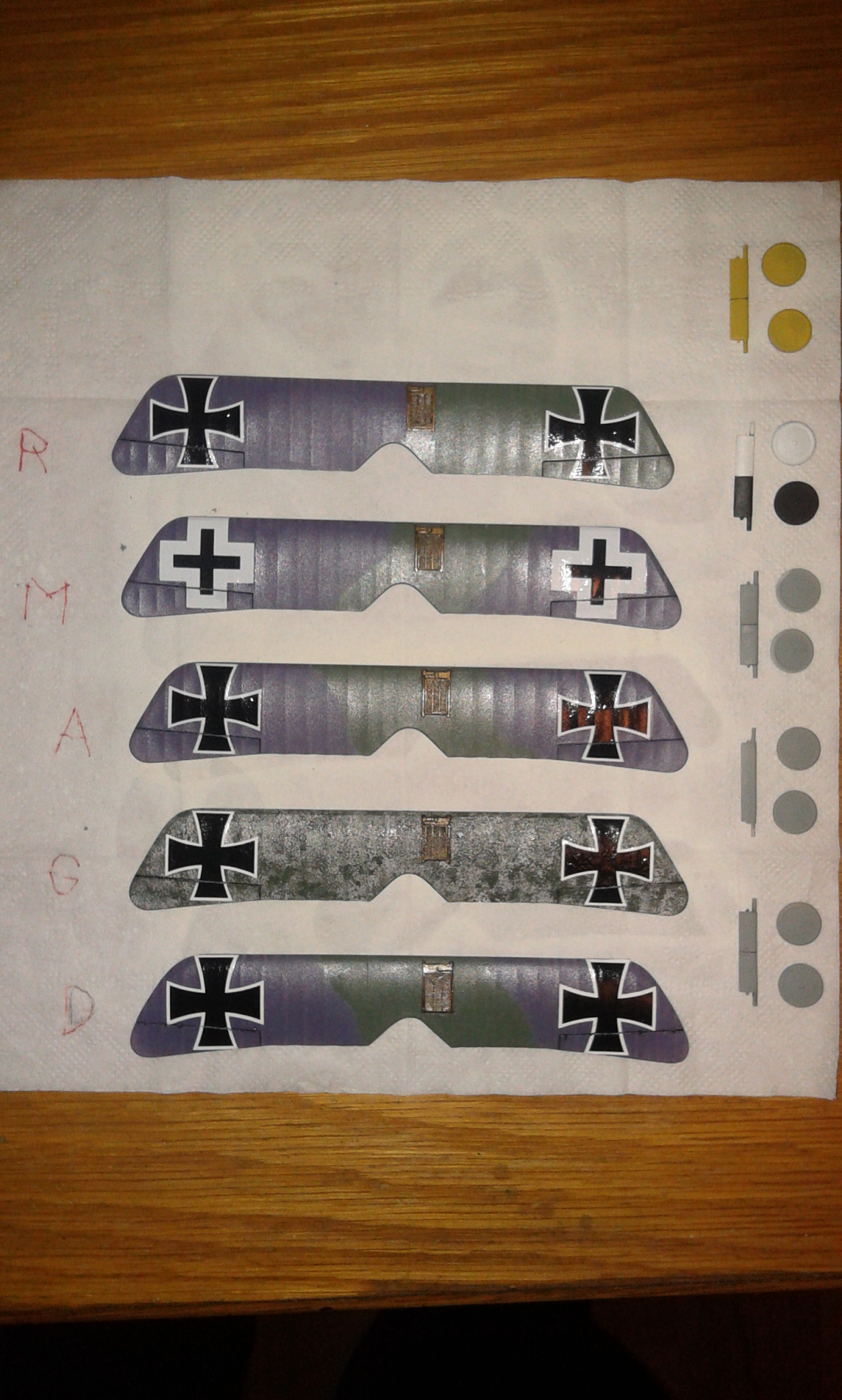 Křídla shora. Ještě matnej lak, protože kříže strašně řvou... rozpracovaná kola a podvozky. Včera v noci jsem procházel podklady a zkoumal fota předloh a Dostler měl disky kol zbarvené tmavou barvou. A jelikož je barva Jasty 6 černá (pruhy na jeho letounu) kola ještě přestříknu černou...