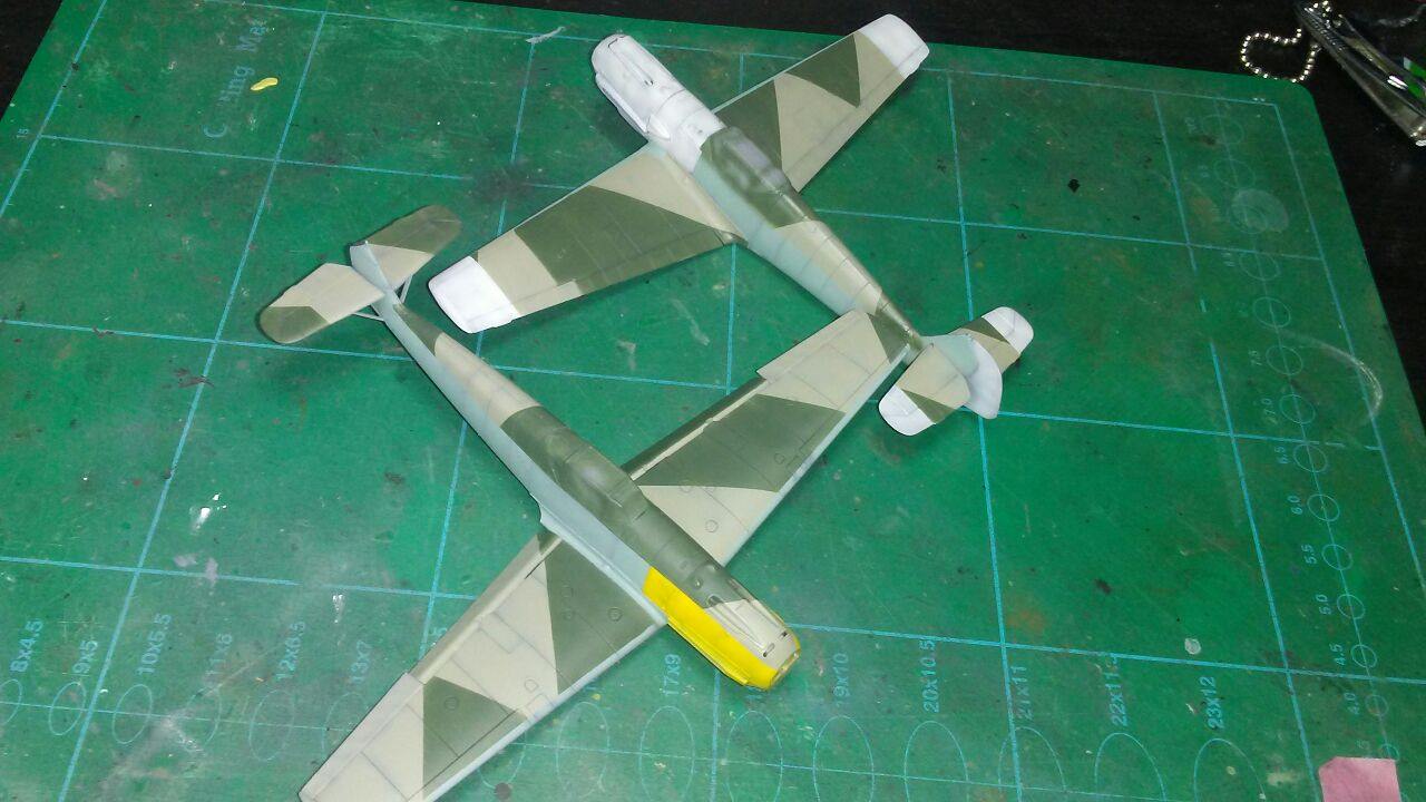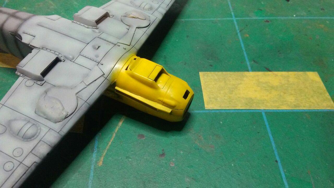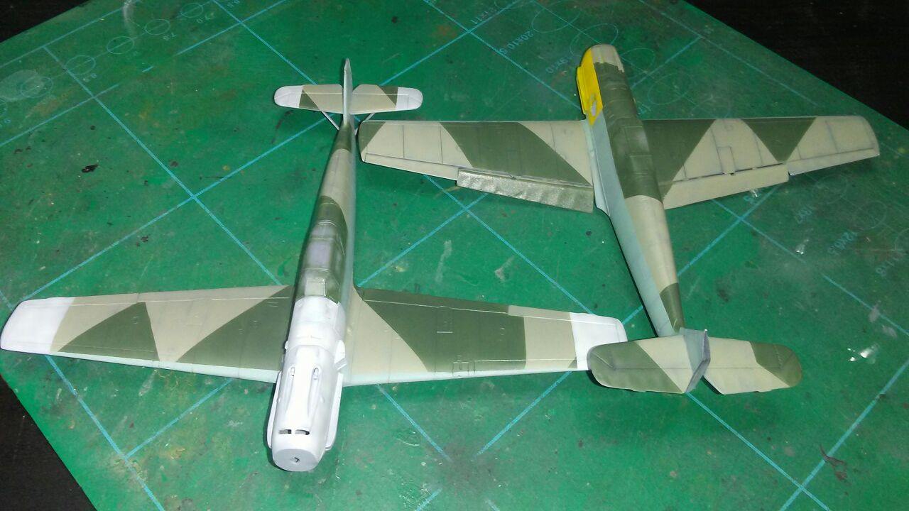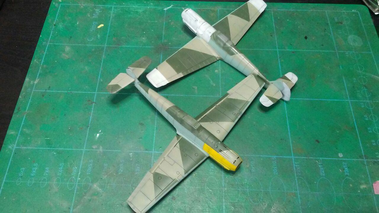 Medzitým som u Airfixu začal striekať spodok s RLM65, ale po prvej jemnej vrstve som si uvedomil, že bude jednoduchšie najprv nastriekať nosy a konce krídiel , tie vymaskovať a potom až striekať kamo.