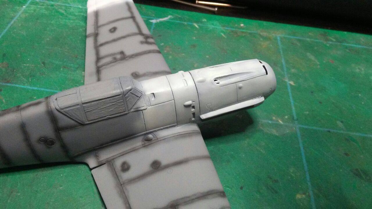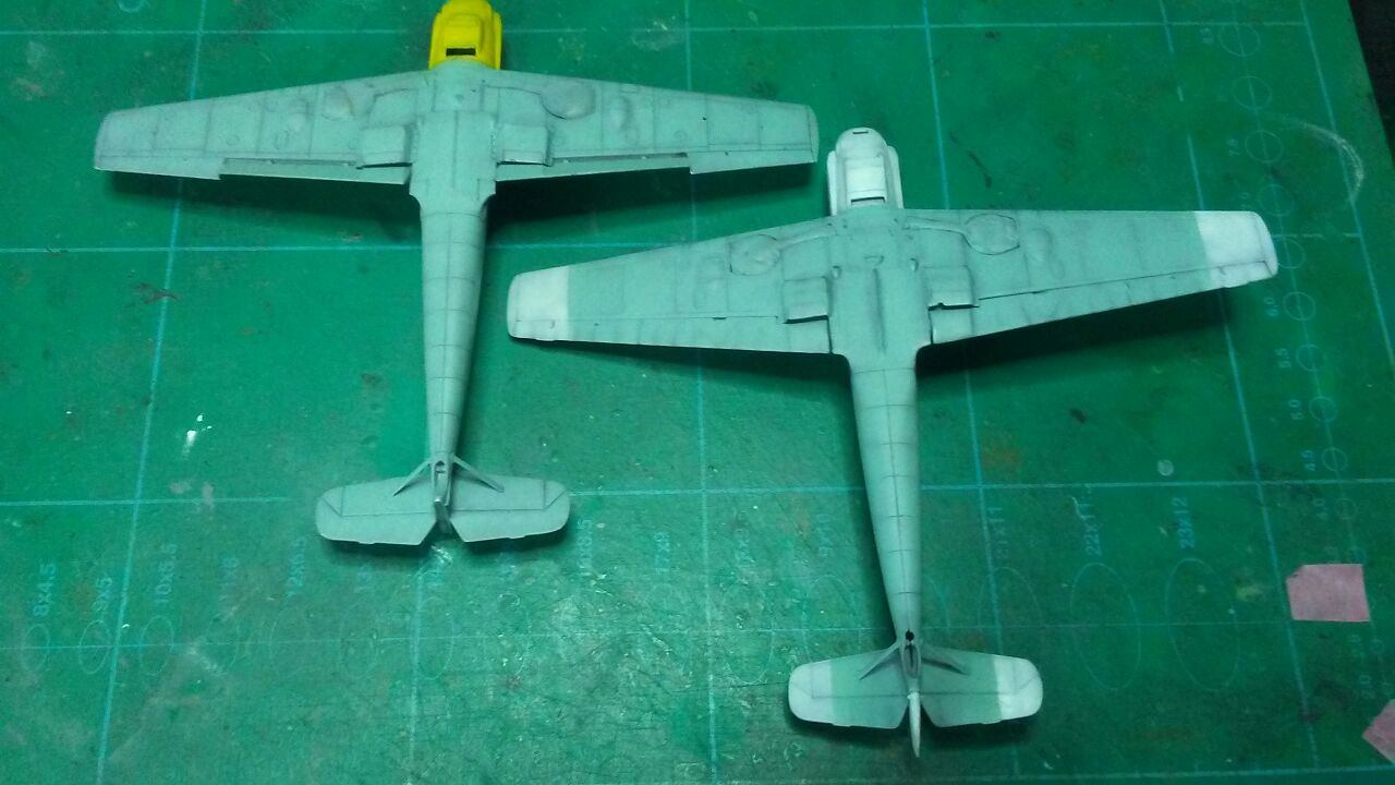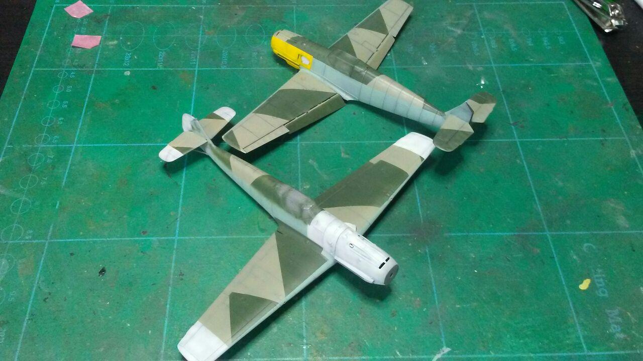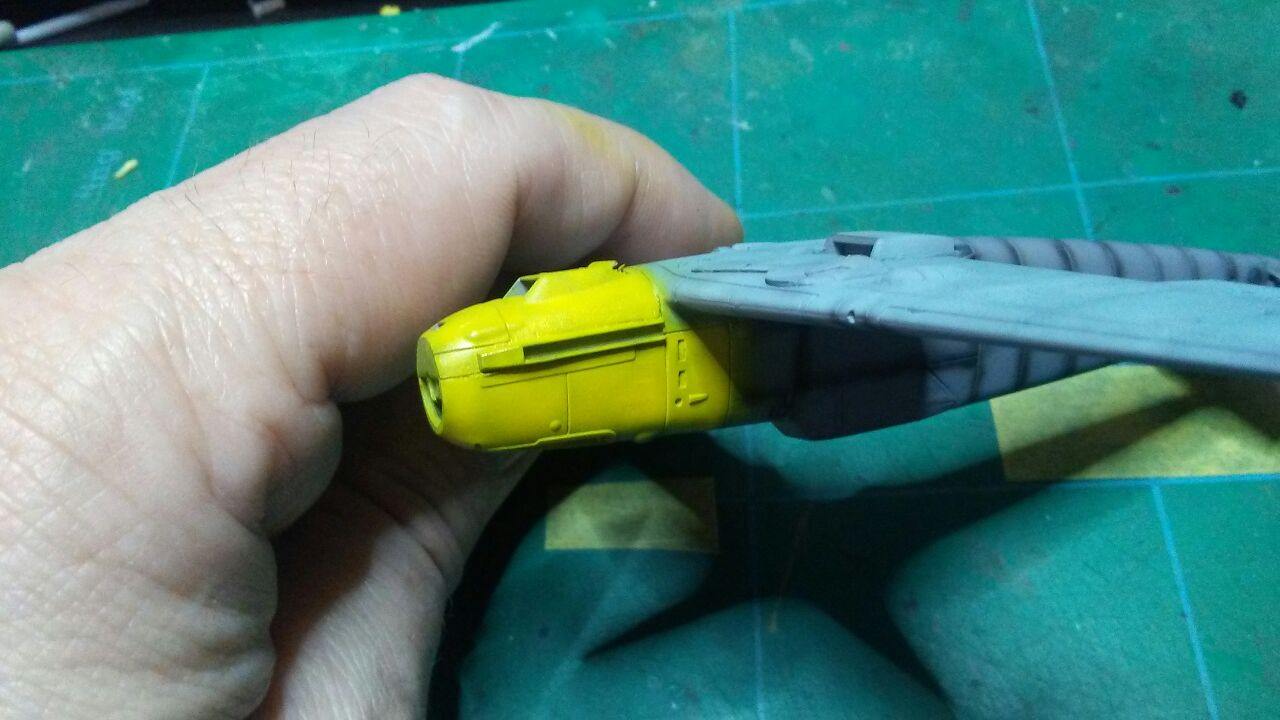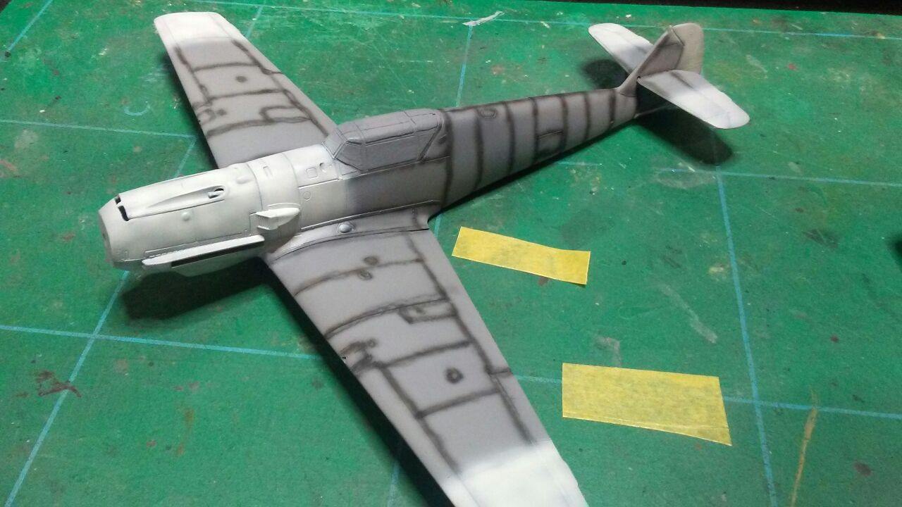 Medzitým som u Airfixu začal striekať spodok s RLM65, ale po prvej jemnej vrstve som si uvedomil, že bude jednoduchšie najprv nastriekať nosy a konce krídiel , tie vymaskovať a potom až striekať kamo.