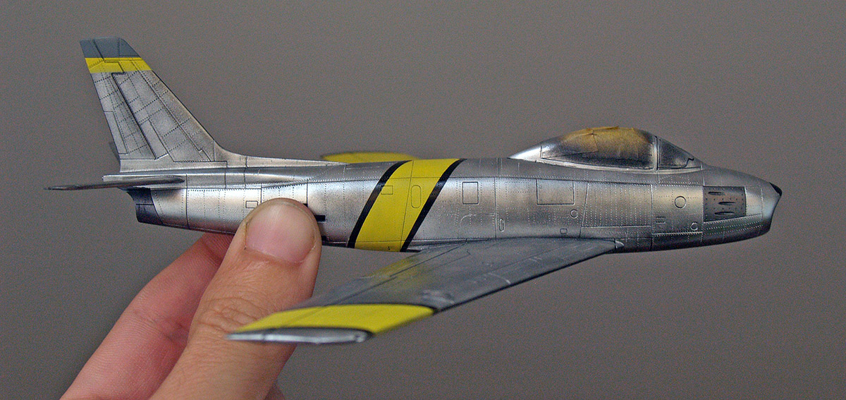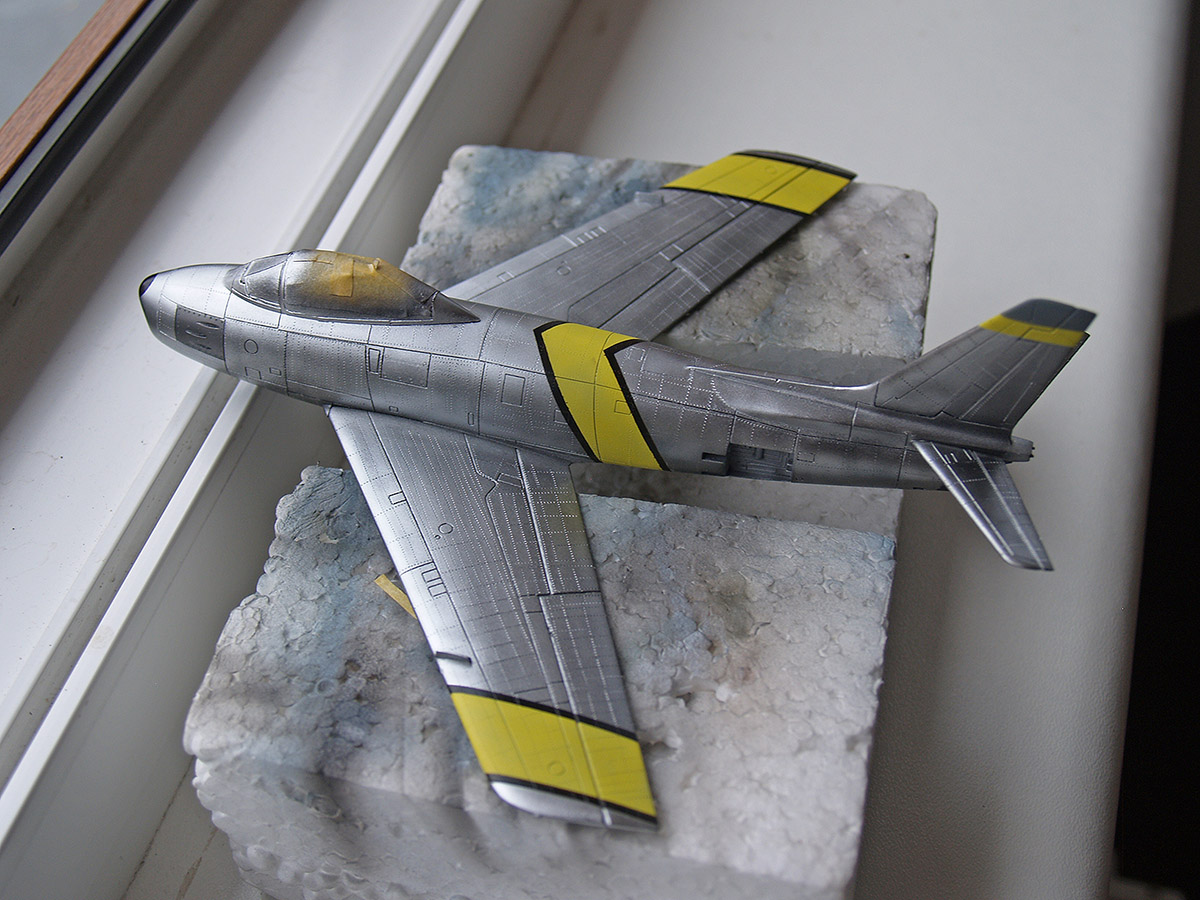 Tak jsem si trochu hrál s tím Sabrem. Zatím jen Gunze SM01 jako základ, Agama pasty na panel kolem kulometů (gun metal) a výtokové trysky (žíhaná ocel) a žlutá a černá místo velkoplošných obtisků.