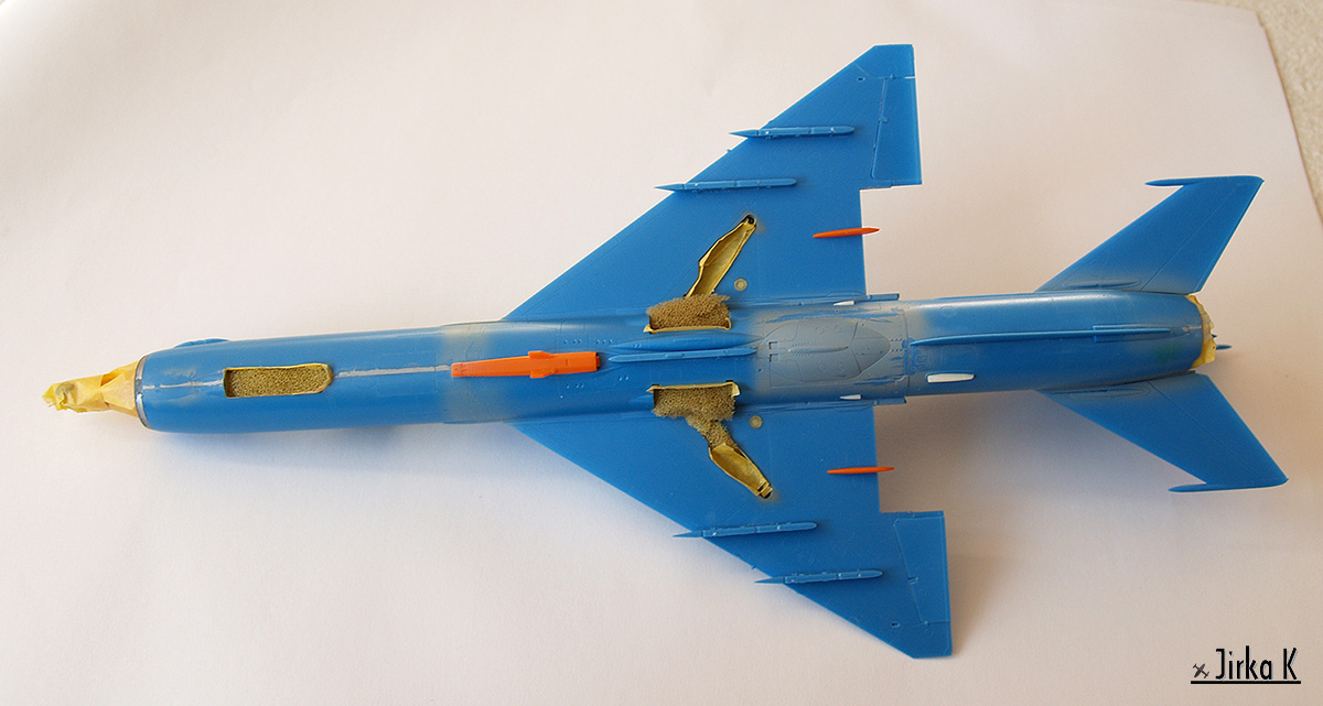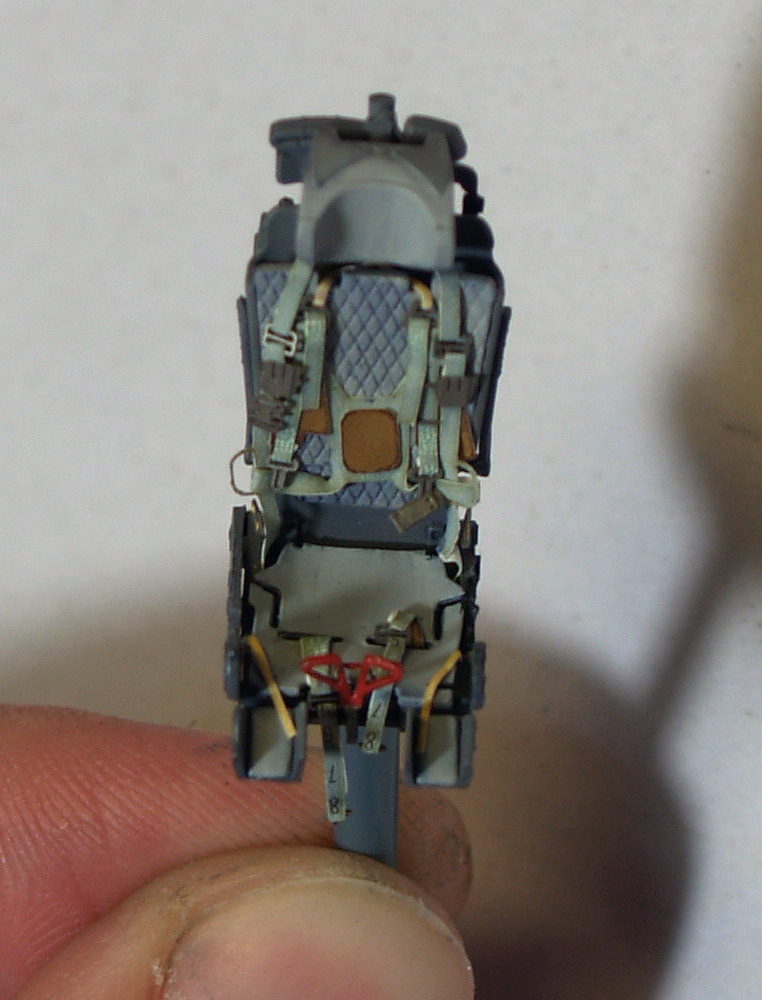Mě se s vypětím všech sil povedlo v sobotu odpoledne zavřít trup (což znamená mít kompletně připravenou trysku, kokpit, přední šachtu a kužel, což je mnohem víc, než jsem zvyklý si hlídat u mých obvyklých WWII strojů) a začal jsem ladit křídlo s šachtami hlavního podvozku. V technologických přestávkách jsem se věnoval něčemu rychlejšímu - odznakové jednadváci v "sesterské" kamufláži... A protože jsem byl tak pěkně rozjetý, ještě v neděli večer jsem u přítulky vytáhl vercajk a během dvou až tří hodin, kdy se ona chystala na pracovní týden a kecala s rodiči, jsem si zahrál na švadlenu a osadil KM-1 textilními pásy. Textilní pásy jsou úžasný výrobek, ale pásy na tomto vystřelovacím sedadle jsou strašná pakárna! Nechtěl bych jejich kompletaci opakovat.