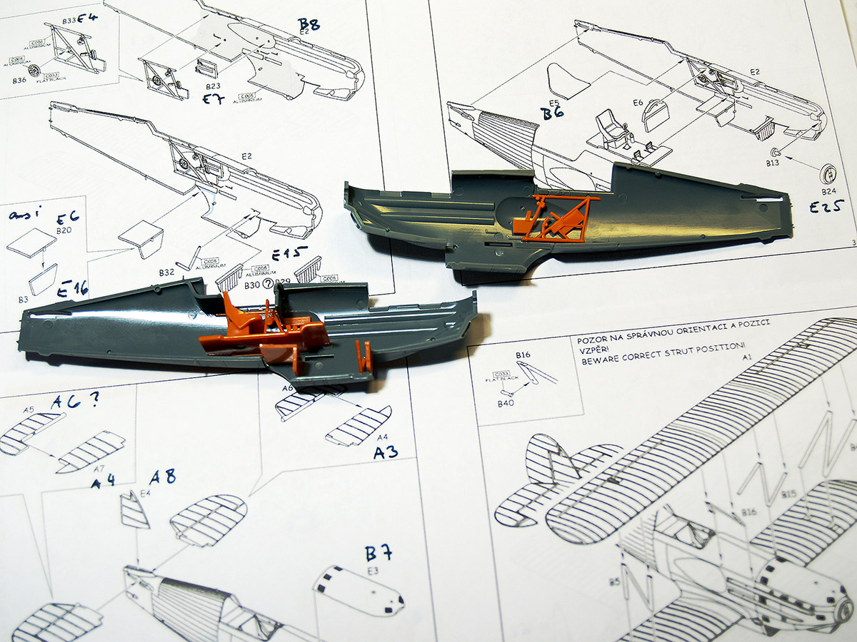 Když jsme na návštěvě konstruktérů u Eduardu jako celá skupina neměli blbé kecy ohledně čtvrtkové stodevítky, odnášel si každý z nás testovací výlisky dvaasedmdesátkové pětistovky... A jak jsem na to tak koukal, našel jsem si návod na čtvrtku a jen tak bez barvení to slepil. Celé to úžasně pasuje a až bude k dispozici návod s přesným určením kam která vzpěra patří (to jsem musel odhadovat, protože číslování dílů je samozřejmě odlišné, navíc jsem dvě pod výškovku ztratil) a kluci dostříknou ty propadliny na bačkorách, bude to famózní malý model.