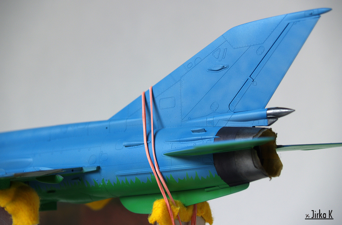 Prakticky všechny barvy jsou lihové Agamy, spodní zelená 19 L čistá, vrchní základ N5 M (RLM65) následně tónovaná čistou modrou a stříkáno nerovnoměrně, v několika různě tónovaných vrstvách. Snažil jsem se o ne úplně jednolitý povrch a docela se mi to líbí.