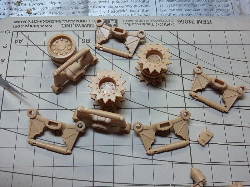 Mám trochu času, tak dávám foto nastříkanej kol. Jinak barva je použita ta, co je na těch chipech na předchozí straně, je to ta na pravé straně(snad jsem se trefil), ještě na to přijde zelený filtr, aby to dostalo ten správný odstín ta jejich "divná" kamuflážné barva....no pak se vrhnu na posunutí-vypodložení vozíků s koly směrem dolů cca o 1,5 mm,jsou moc nizko. Když jsem koukal na fotky, tak opravdu Sherm sedí na "vyšším" podvozku a když jsem to zkoušel na modelu, ta i pod podběhama zůstává hodně málo místa pro pásy, takže to tomu pomůže.Jinak jsem objednal pásy od AFV, tak čekám na ně..jsem si na sebe ušil bič, ale bude to vypadat aspoň pěkně, když nic neposeru..o:)