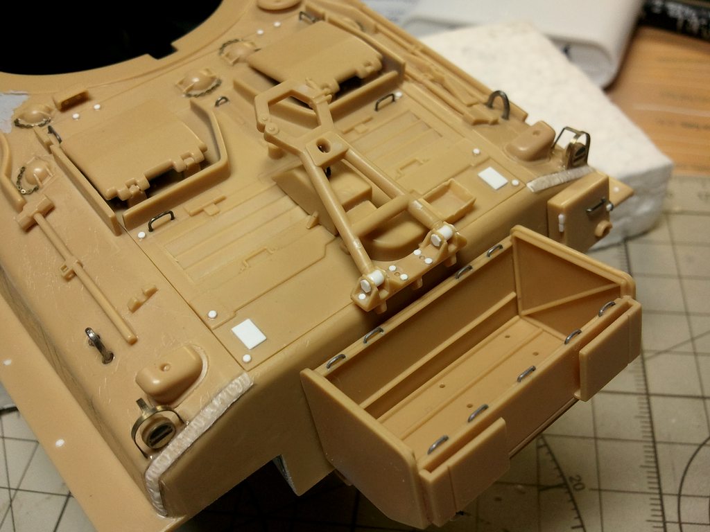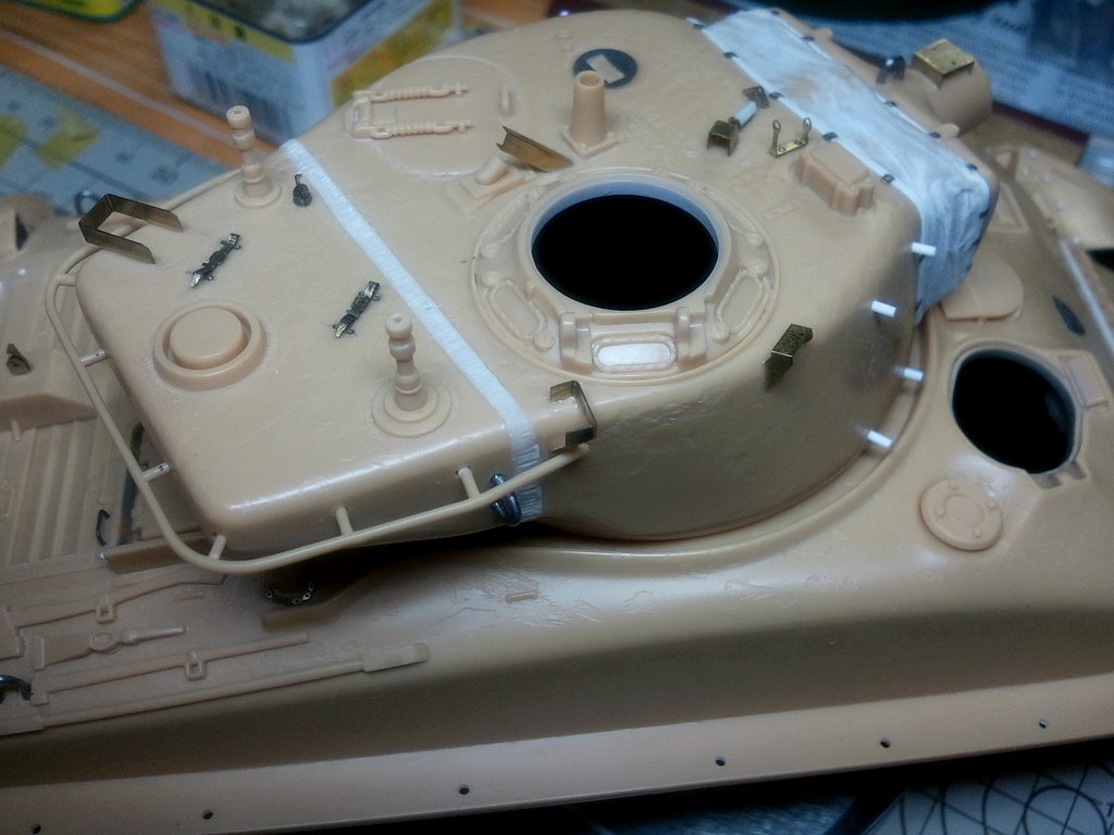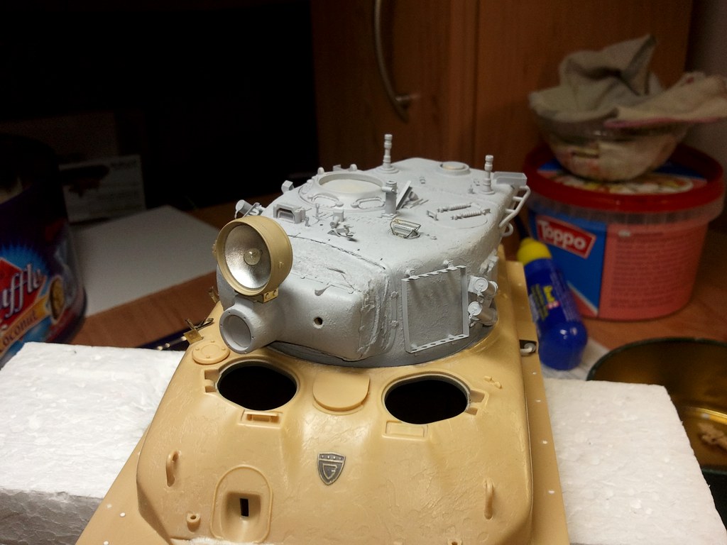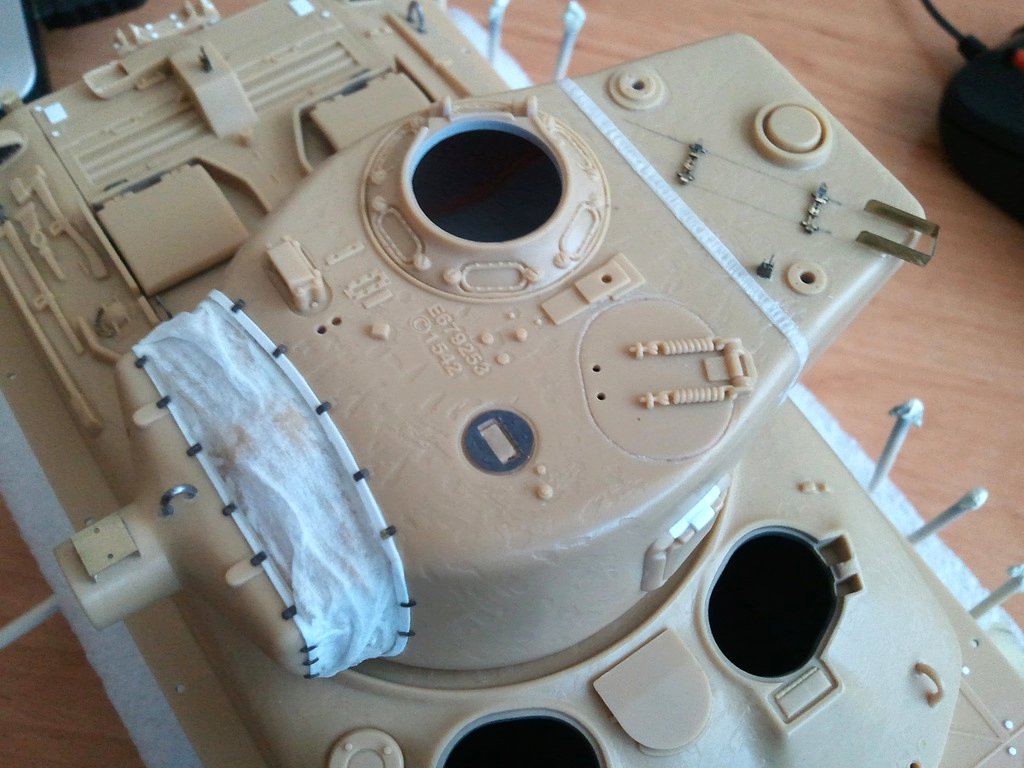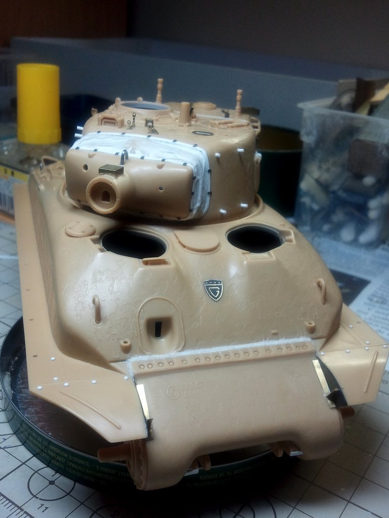 Zdarec kolegove...o:) tak jsem opet neco dodelal, na Shermika, aby se to zacalo vice a vice podobat tanku a ne dilum, ktere cekaji na slepeni. Upravoval jsem bocni vyfuk, zadni drzak laufu, schranku na bagaz, dále jsem dělal světlomet, k němu ještě přijde kabel, ale ten bude až to budu dávat na fest na vež. Pak jsem musel trošku potůnit zadní nápravy, a relativně pomálu celé je předělat, jelikož byly v stavebnici zcela špatně, dodělány některé šrouby, sváry, které sice vypadají na fotkác silně, ale v reálu jsou v pohodě, je to focené hodně z blízka, takže to docela zvětšuje. Pak je zarovnám trošku s litým pancířem, ež ho budu naznačovat, přetáhnu surfem, takže se zase potlačí. Je zajímavé, že jejich tlouštka je udělaná jako naznačení ze stavebnice, co bylo na plastu..o:) dále jsem také upravoval skřínku v pravo s komunikací, která byla docela jednoduše ztvárněná,a v návodu od Acády byla montáž zakreslena obráceně....takže pozor na to.