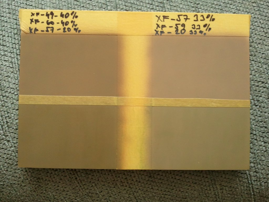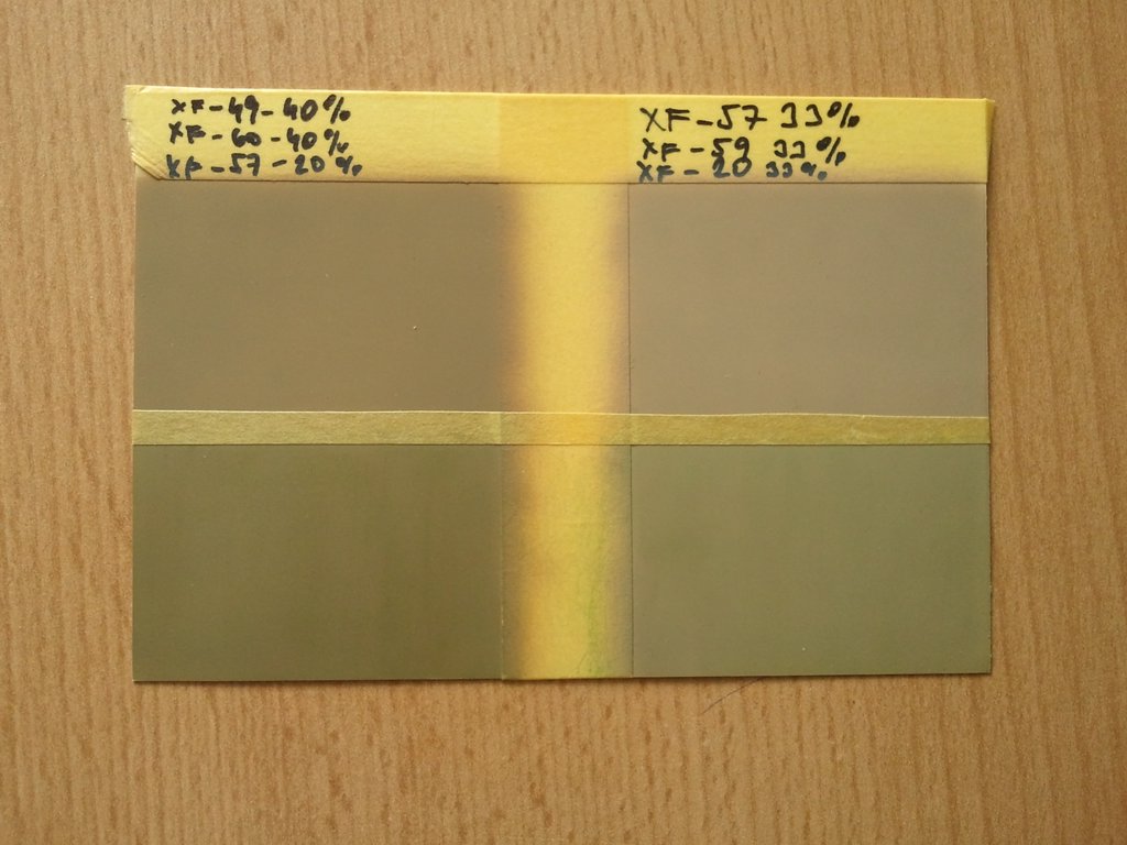 Zdarec, včera jsem si zkoušel nastříkat chipy s barvou kamo, které by přicházelo v úvahu, na M51, dělám Late verzi 1973 rok, takže by to měl mít kamo v pískověšedozeleným odstín či něco podobného, co jsem viděl a četl. Vyzkoušel jsem tyto dva mixy, které přikládám na fotkách ty dva na hoře jsou čistě nasříkané mixy, dva dole jsou přefiltrované zelenou, jen zkusmo, abych viděl, kam se ten odstín pohne. Měl jsem doma pouze jeden odstín zelené, odstín je hodně podobný zelené barvě čerstvé trávy, takže to dle toho také vypadá(je to hodně do zelena)a lehce jsem to s tím filtre též přehnal. Potřebova bych rozsoudit, jaký odstín by aasi připadal, který by vypadal správně.Omlouvám se za fotky, ale pokaždé se ten odstín posunul lehce jinam, tak přikládám více foto, vše je focenu bez blesku, za různých světelných podmínek.