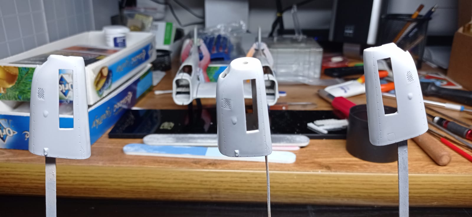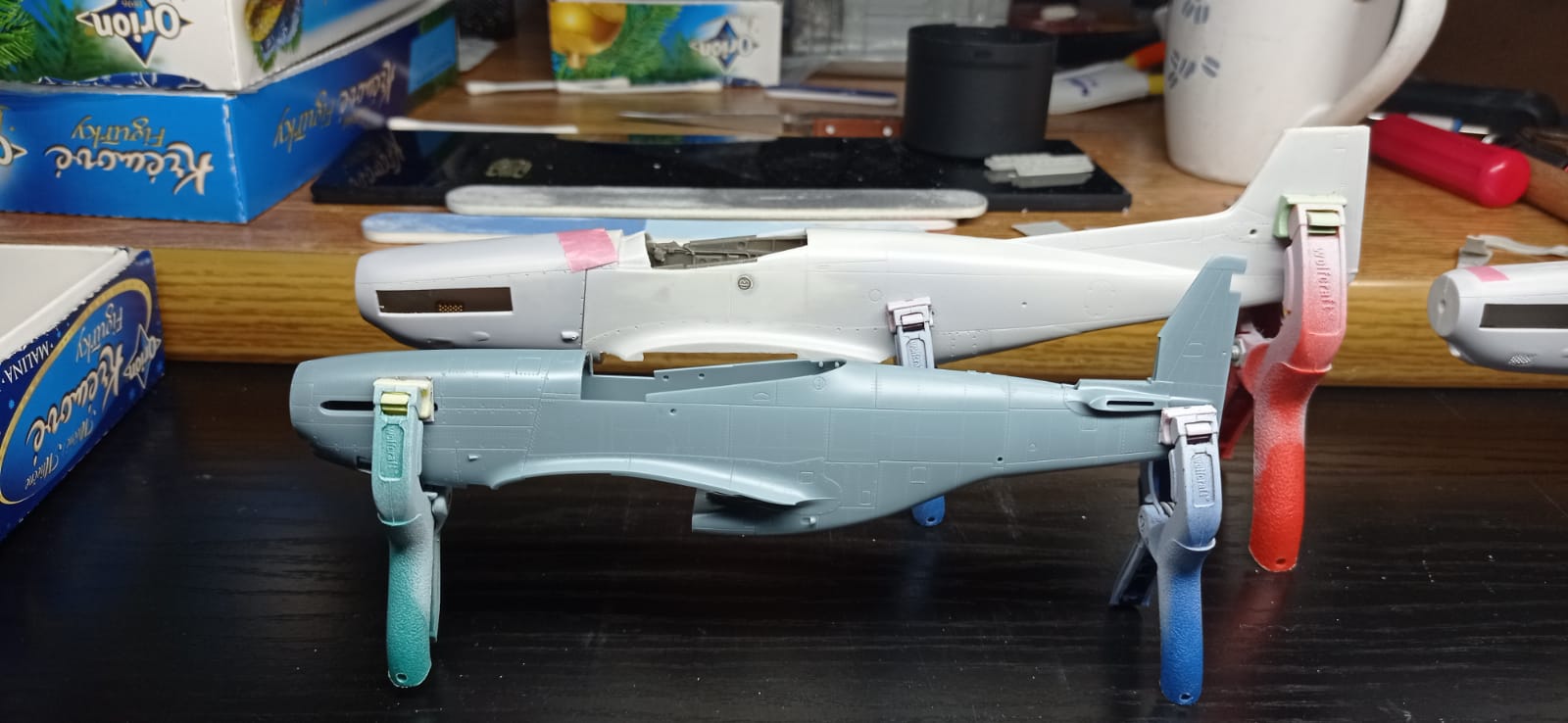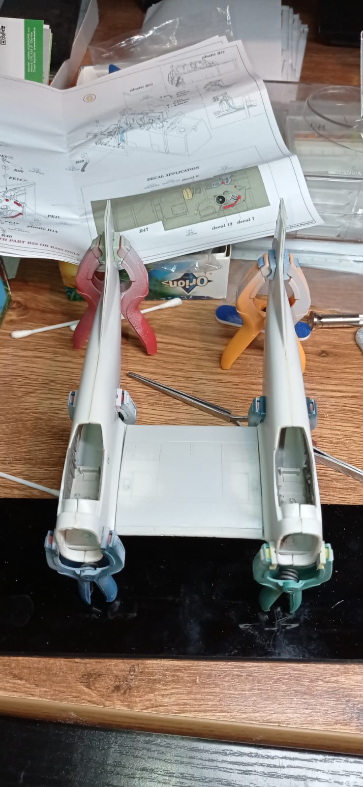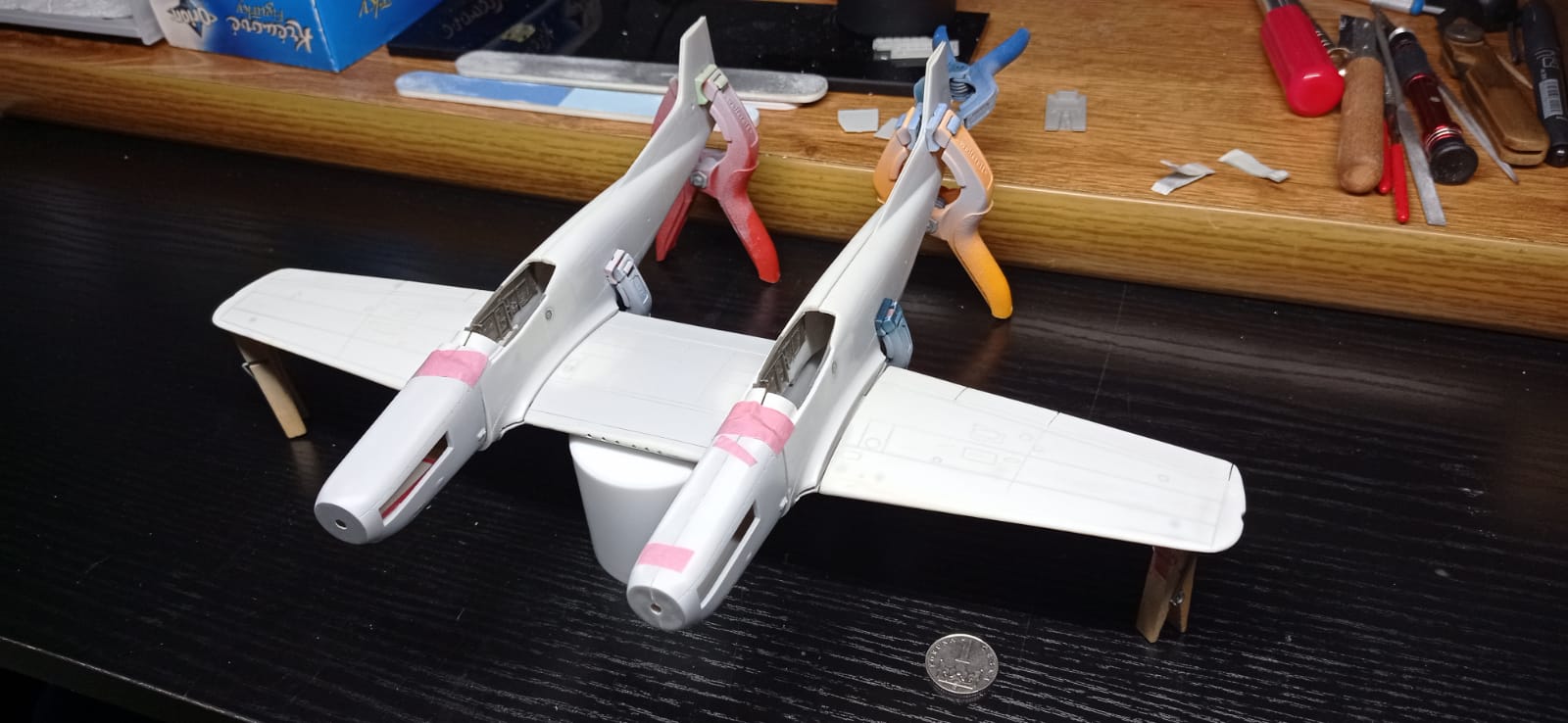 mám to rozdělané už několik let, ale snad to začíná nabírat konkrétní podobu, vše kromě křídel a a centroplánu je zatím poskládáno nasucho, trupy jsou srovnávány s trupem P-D od Eduardů, kokpity jsou také edíci, pouze palubky jsou z leptu na tuto stavebnici