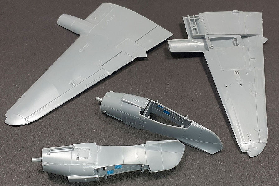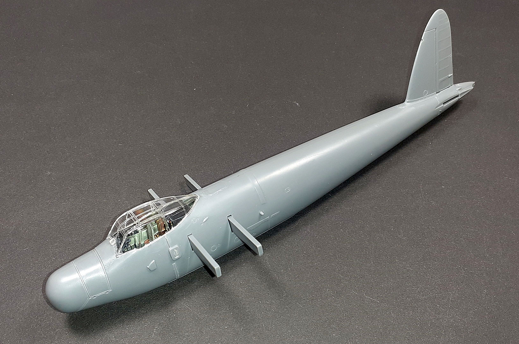 Kokpit je poplatný mému stavění z tehdejší doby, takže čirá krabička a pásy z obtisku. Chtěl jsem urvat kabinku a dát tam alespoň leptané pásy, ale něšlo to, drží jak helvétská víra. Tak jsem jenom vytmelil spáry, vybrousil spoje, obnovil rytí a pokusil se opravit neskutečné množství lepidlem vyleptaných otisků prstů. Ještě jsem stihl slepit křídla a motorové gondoly.