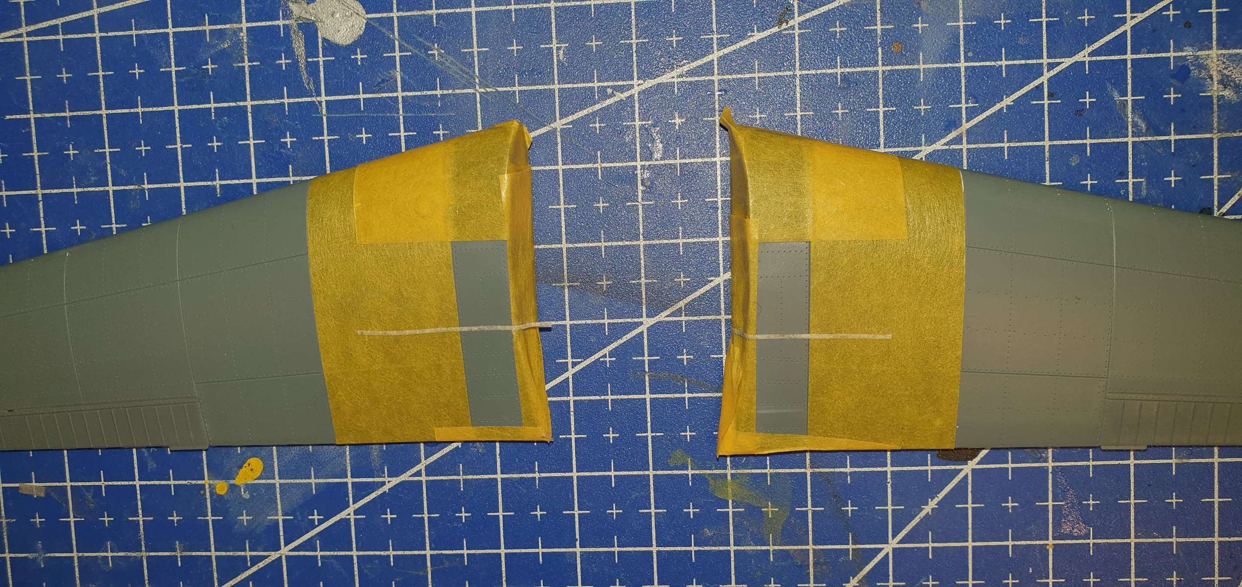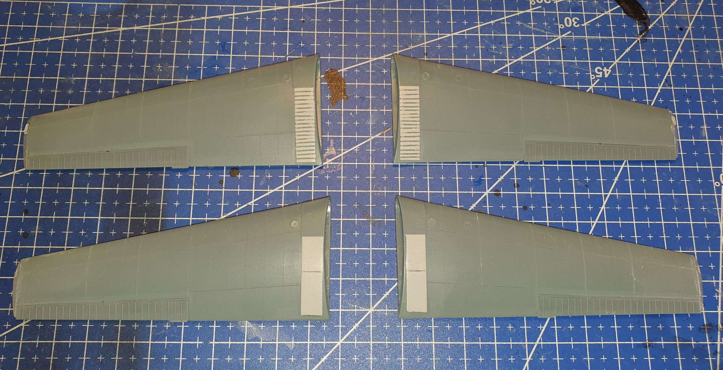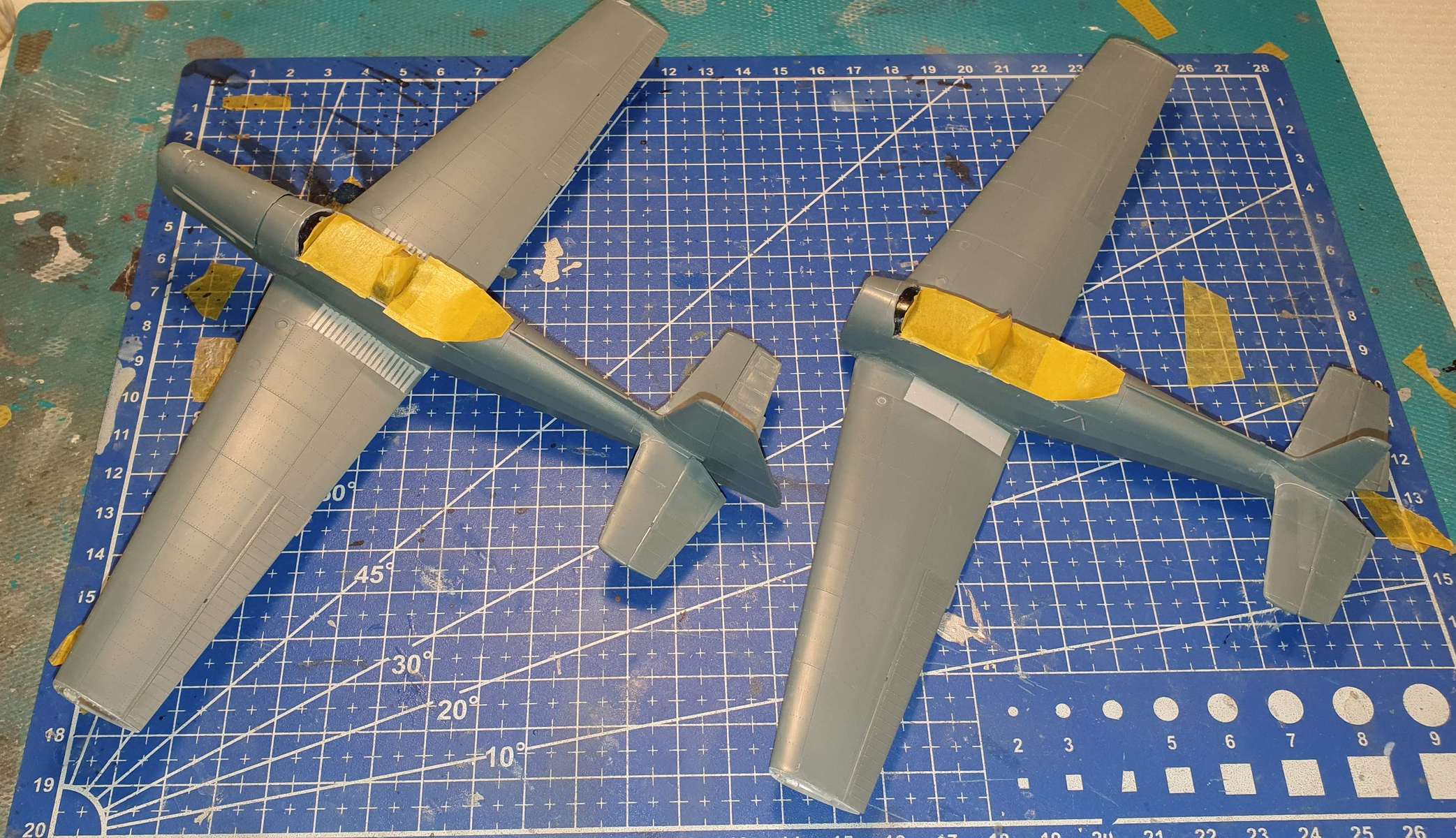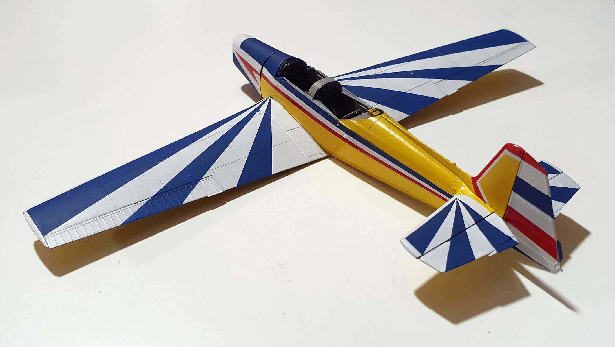 Za víkend hrubá stavba hotova. U Bezáka jsem se rozhodl nalepit motor a podvozky až po nabarvení - podvozky proto, že by se mi blbě maskoval a stříkal modrý proužek, motor jednak proto, aby se mi jednodušeji maskoval, druhak proto, abych mohl dát výfuky až do nabarveného motoru (snad se mi to tou dírkou vzadu povede).