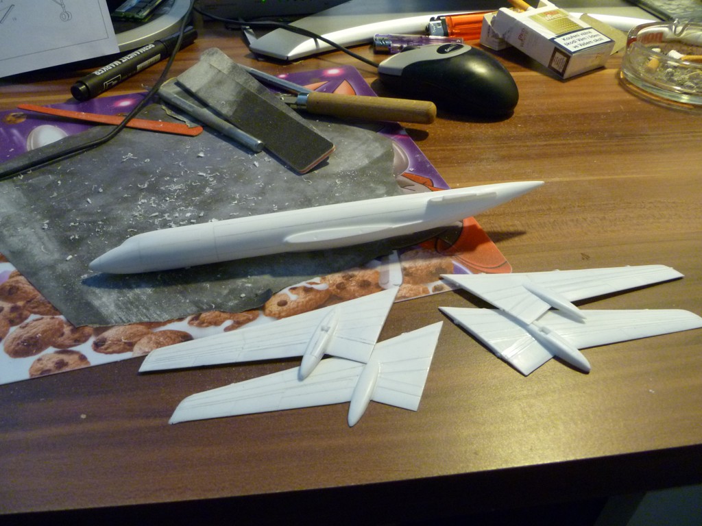 Včera večer jsem komplet protáhl rytí a nalepil závaží, cca 14g. Dnes slepen trup, docela fuška spojit dva na sebe nepasující díly. Okolo sebe mám plastového prachu, až, až. Amputoval jsem čumák, který patří na jinou verzi a aplikoval jsem správný nos.