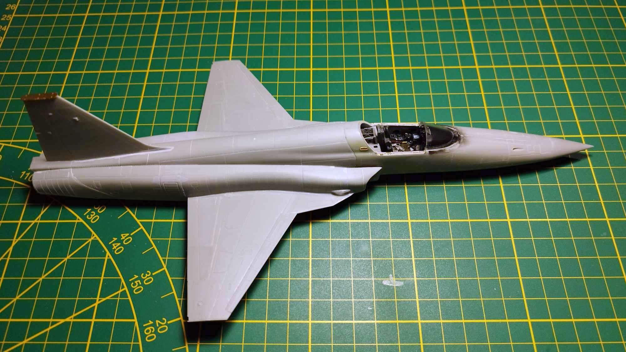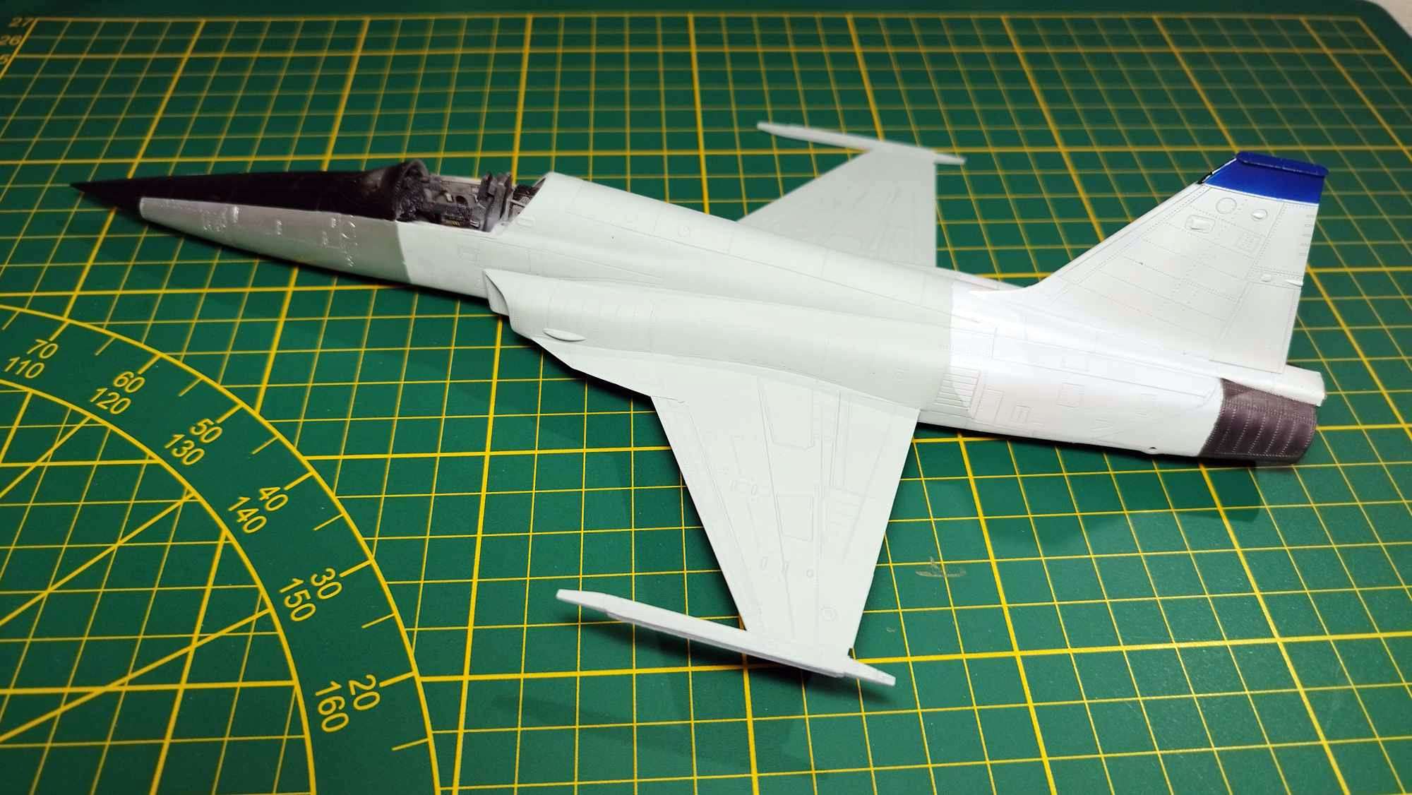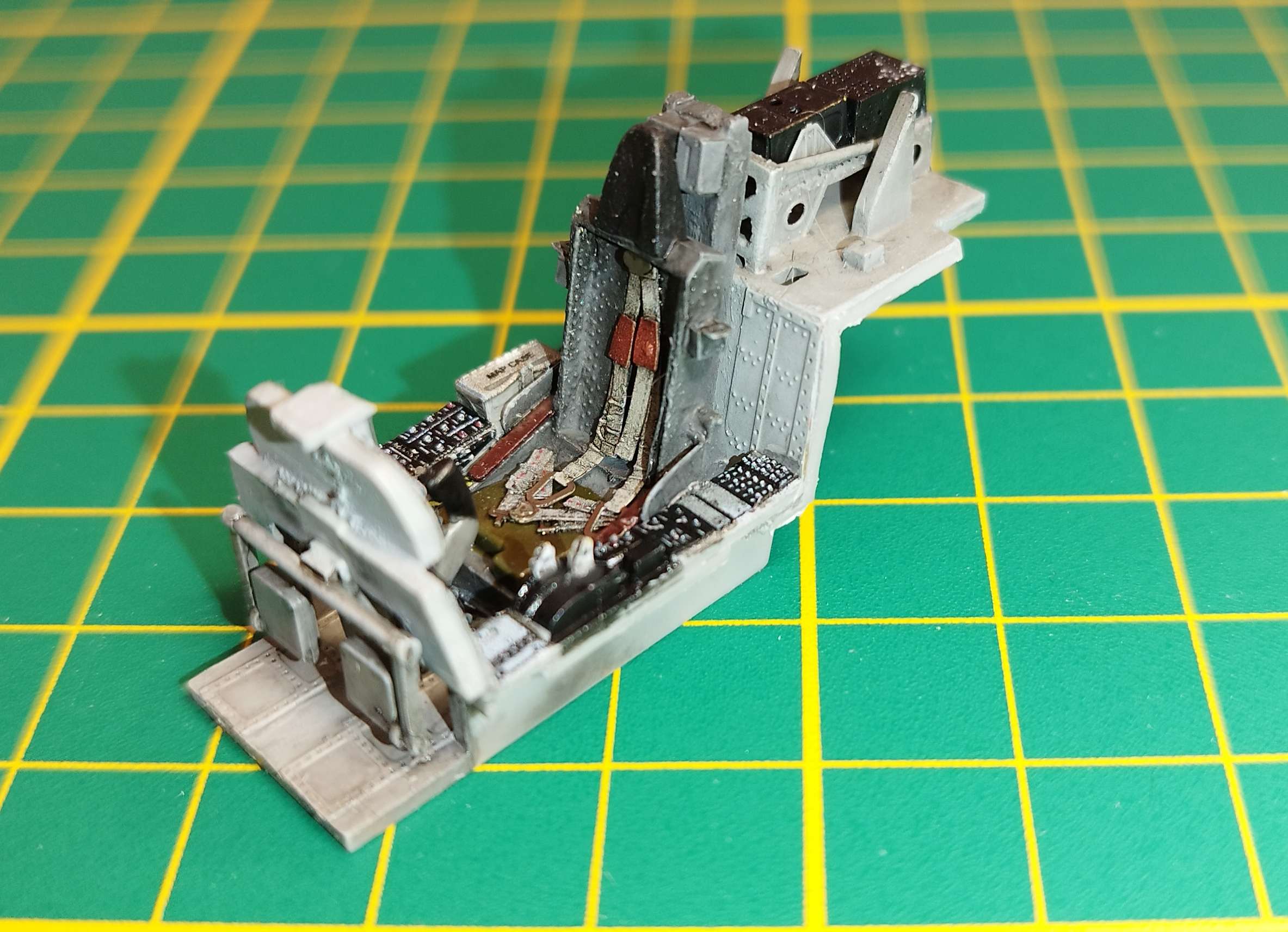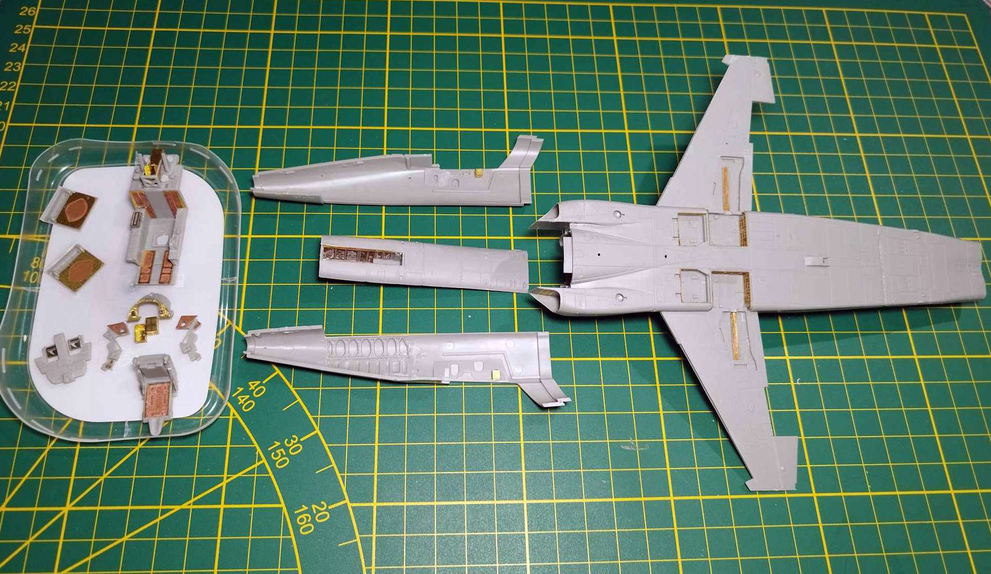 Po dnešním deštivém odpoledni mám oplechováno a sestavený základ zadní části trupu (výhodou stavebnice je, že se dá stavět "po bojovkářsku" = skoro celý základ (kromě kokpitu) se dá slepit, aniž by člověk vytáhl pistoli a barvy