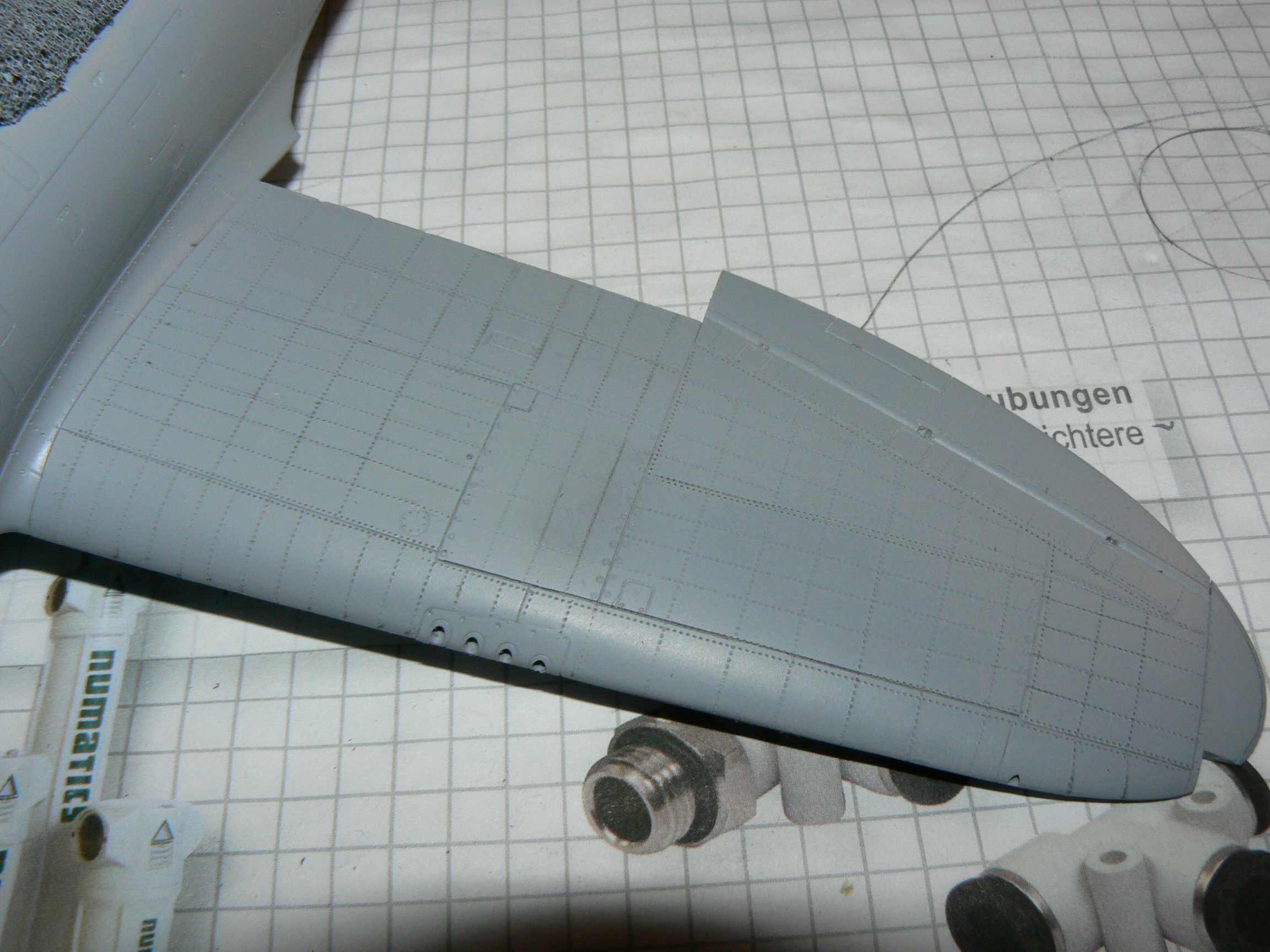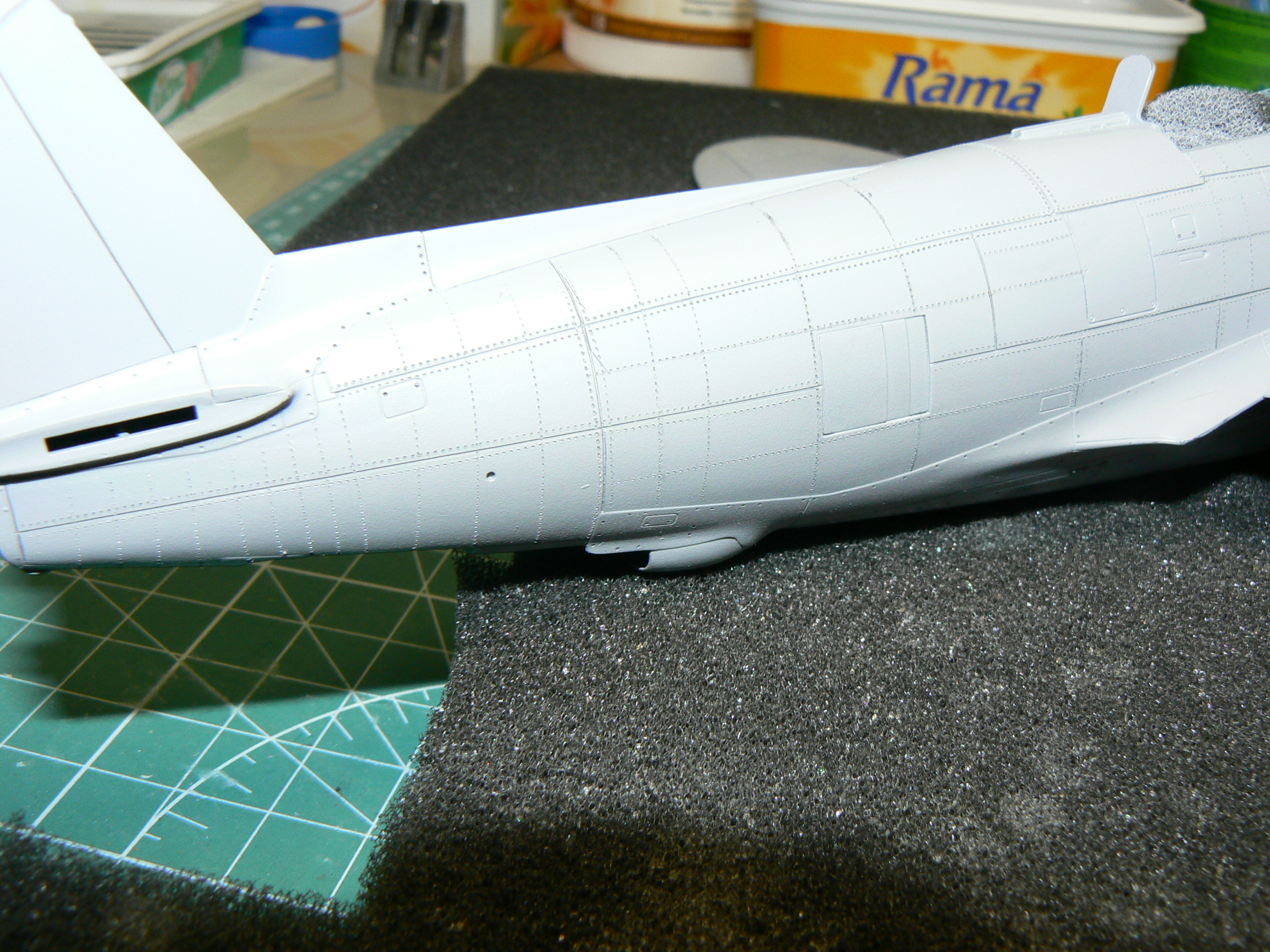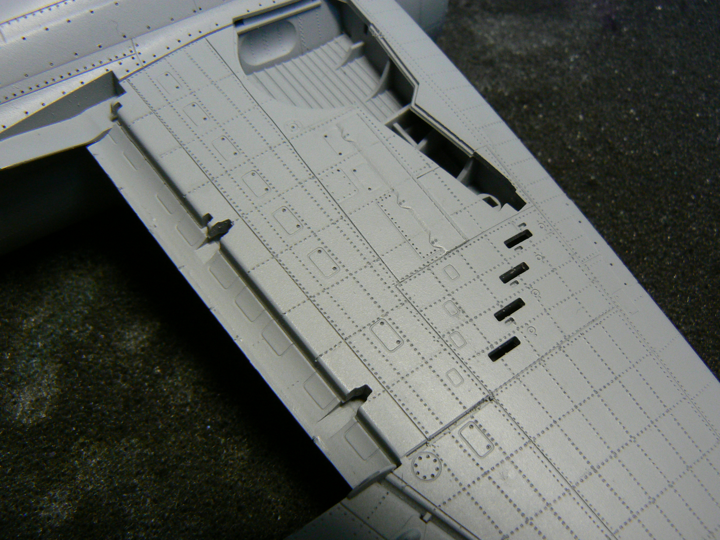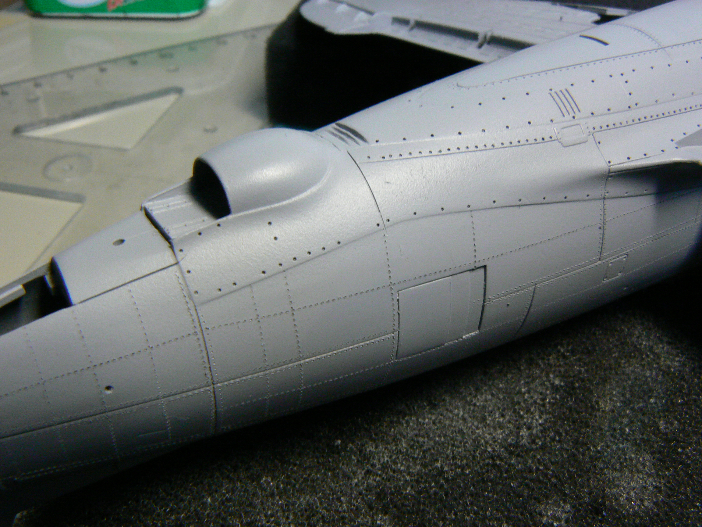 Na první nejtování to máš pěkný.Já osobně nýtuju na holej plast,před nástřikem Surfu.Ale takhle to vypadá taky pěkně.Taky jsem zrovna nýtoval Thunderbolta od Tamky.Bude celostříbrnej.Držím palce do další stavby.