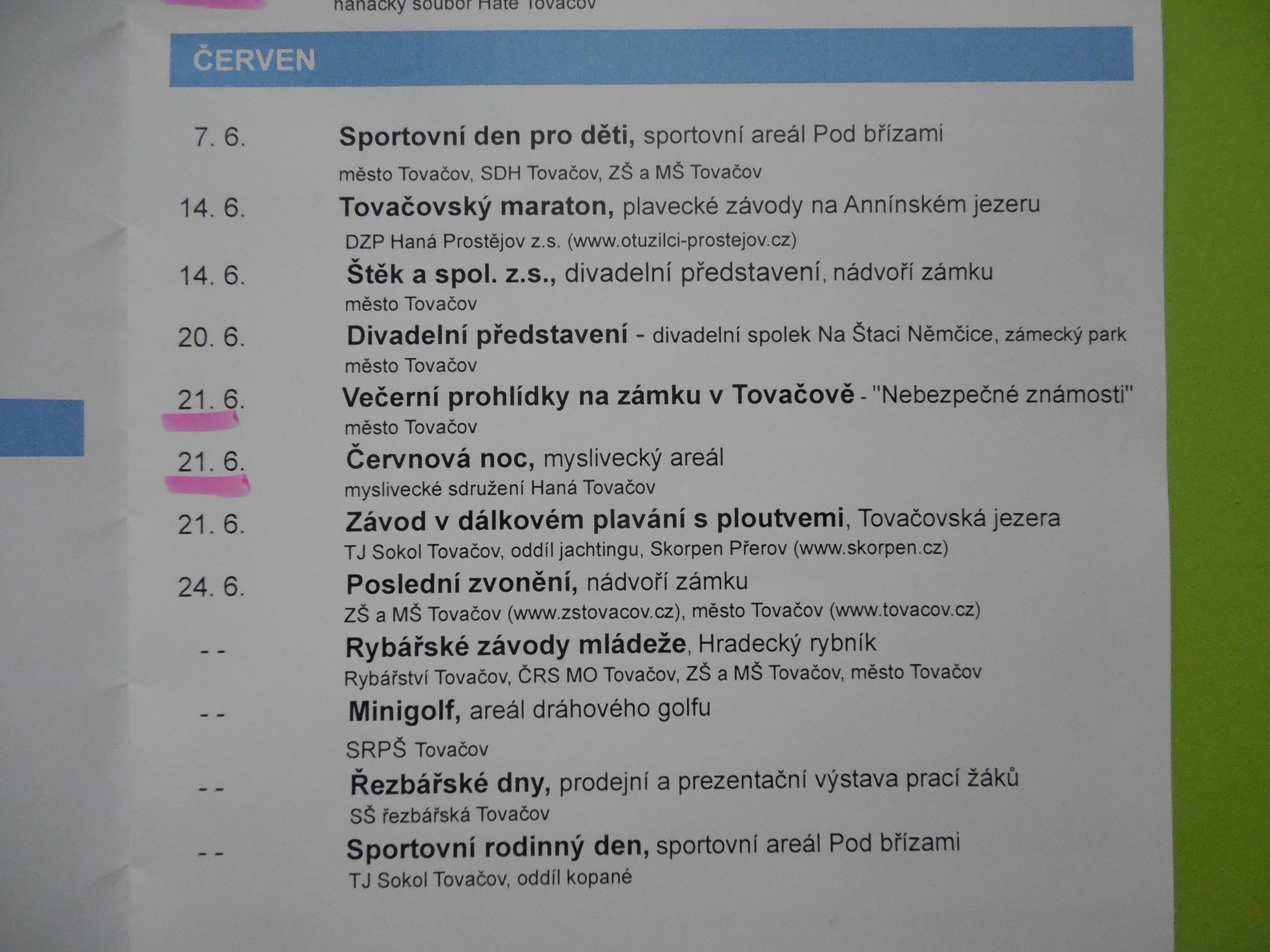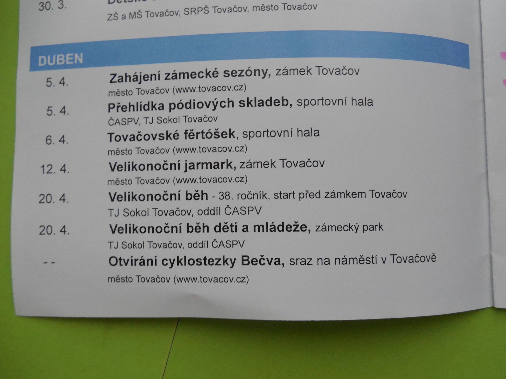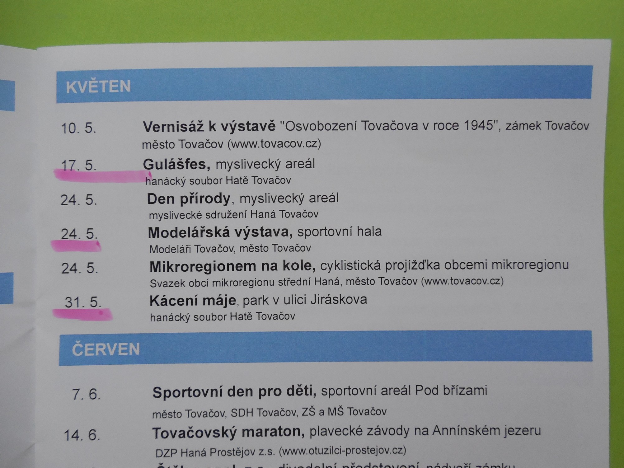 Pro nás je samozřejmě podstatný datum 24.5. Jinak v ten den se koná i cyklistický Mikroregion na kole, takže někteří z vás můžou k nám i na a využít cyklotrasy kolem Tovačova, kolem tovačovských rybníků a jezer!