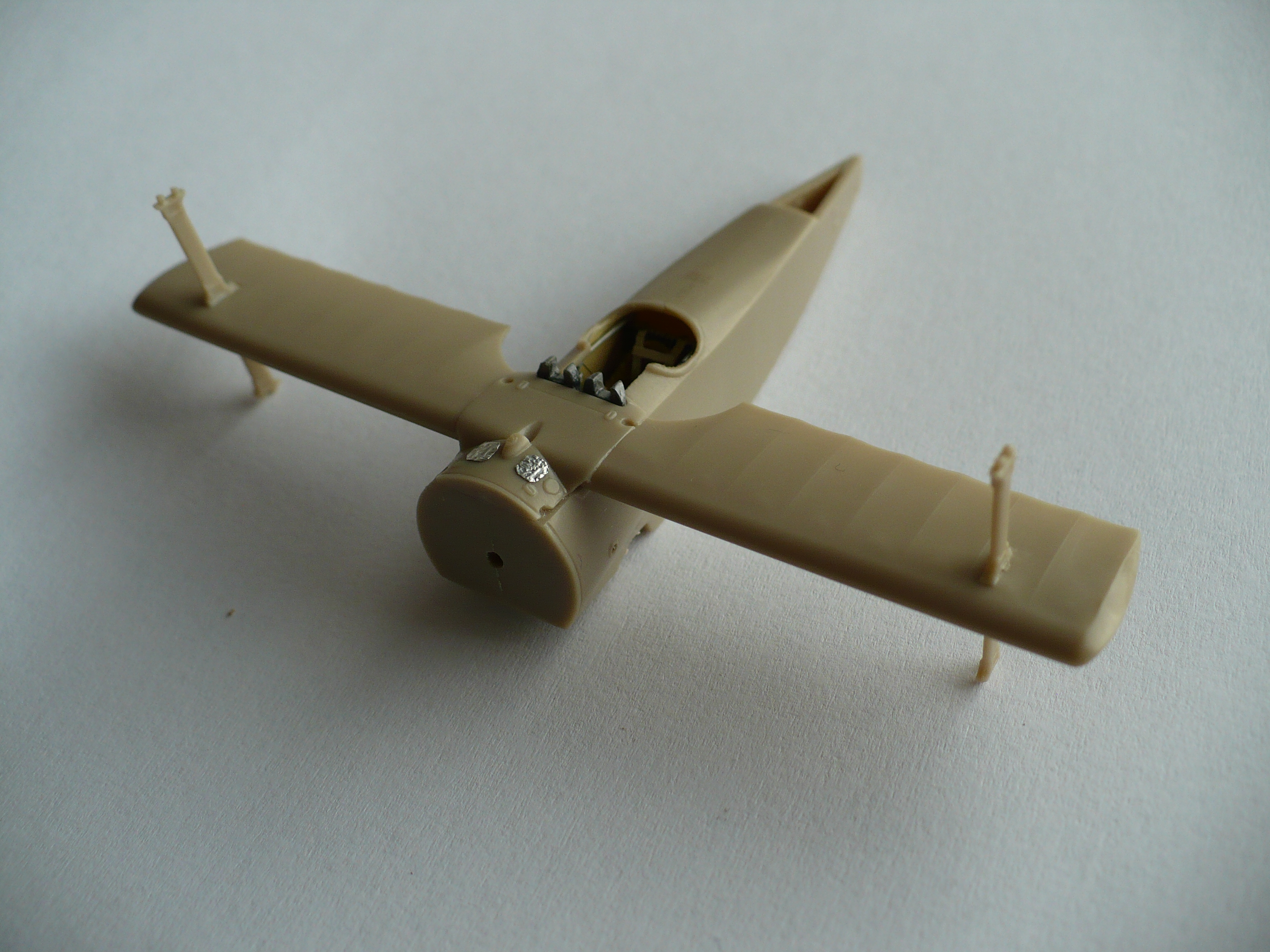 Lem motorového krytu z hliníkové fólie a zatmelena spára na spodku podvozkového křidélka. To je chyba obou Edích stavebnic. Dvasedmdesátky i čtvrtky. Podvozkové křidélko Dr. I bylo hladké, bez přezek a spojů.