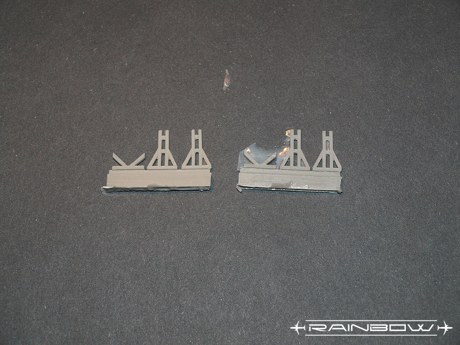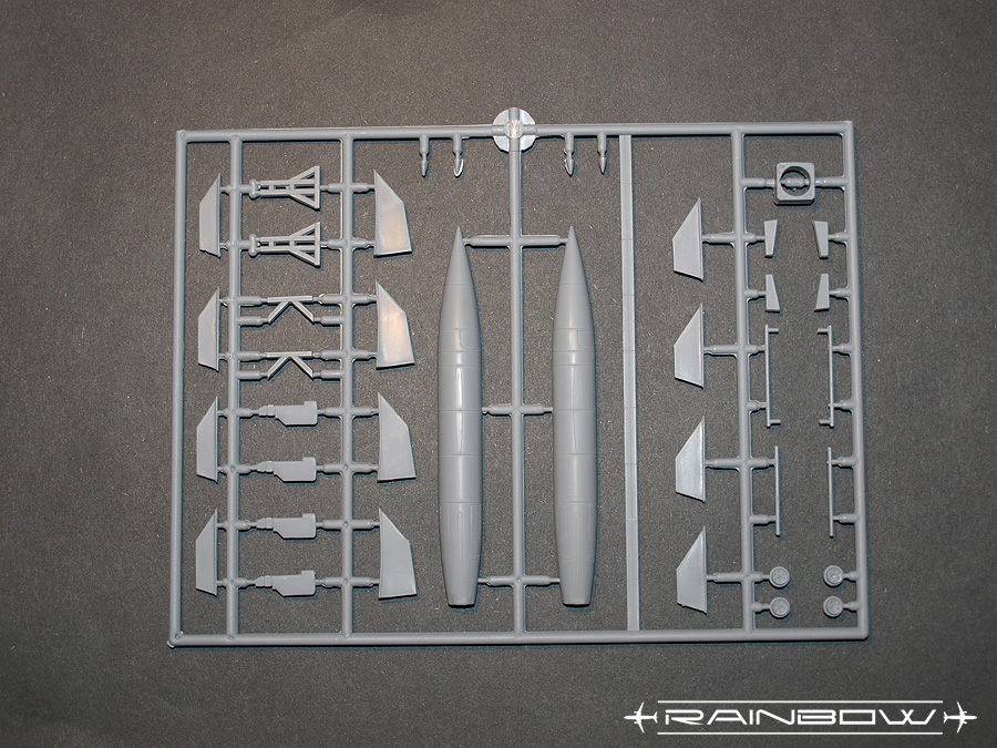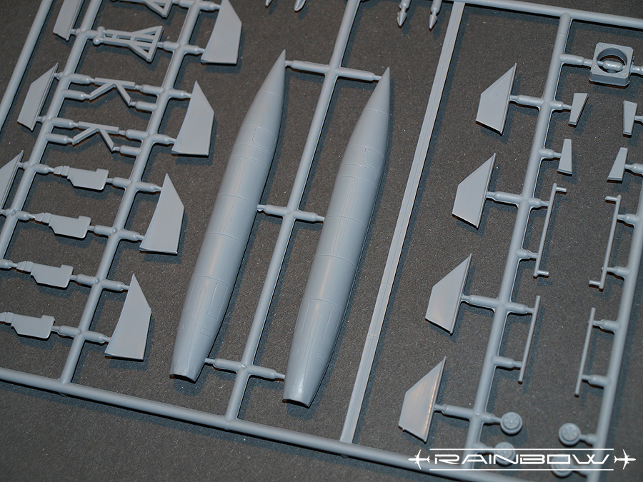 V malé krabičce najdeme 31 dílů z šedého plastu, 6 dílů z PUR (těmito díly můžeme nahradit podpěry pokud budeme chtít mít raketu „naležato“) a malou planžetu s lepty (upínací popruhy). Na plastových dílech jsem až na malé otřepy nenašel žádnou propadlinu, nebo jiný kaz takže stavba by měla být bezproblémová.