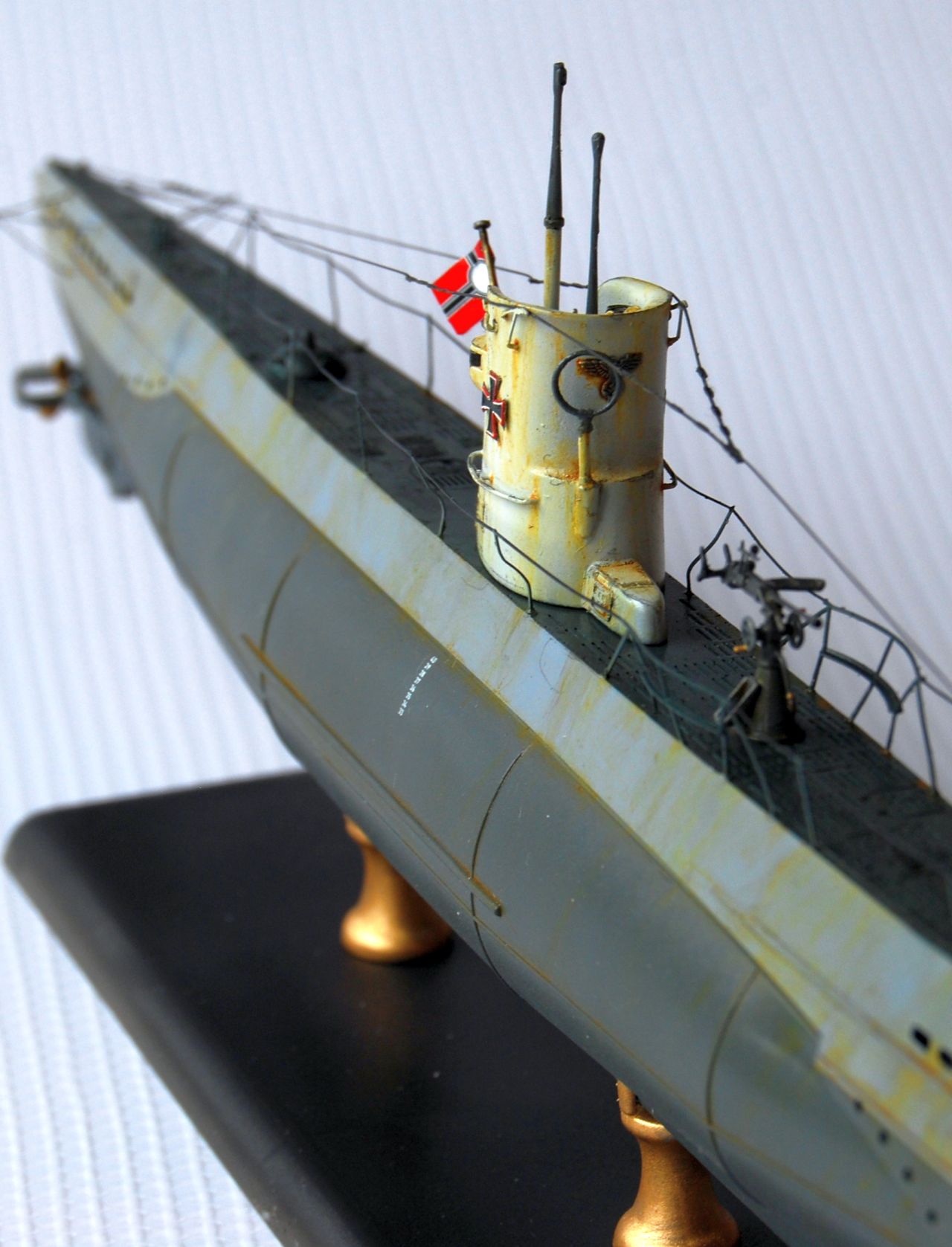 Model Revell (ICM) + lepty od Ottu Geržu. Nie je to model konkrétnej ponorky. Toto je môj prvý model kde som si vo väčšej miere skúsil "opotrebenie". Lepty otvorov som použil jen na na veži (inde som sa ich bál použiť z dôvodu mojej nešikovnosti). použil som Ottovu metódu "umiestnenia pomocou pájkovačky". Napodiv mi to celkom šlo. Na budúcej ponorke (VIIC/41) to skúsim v oveľa väčšej miere