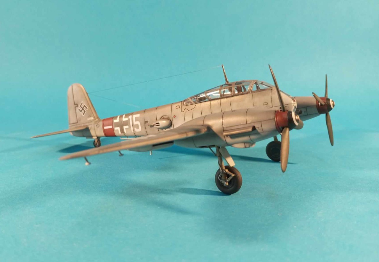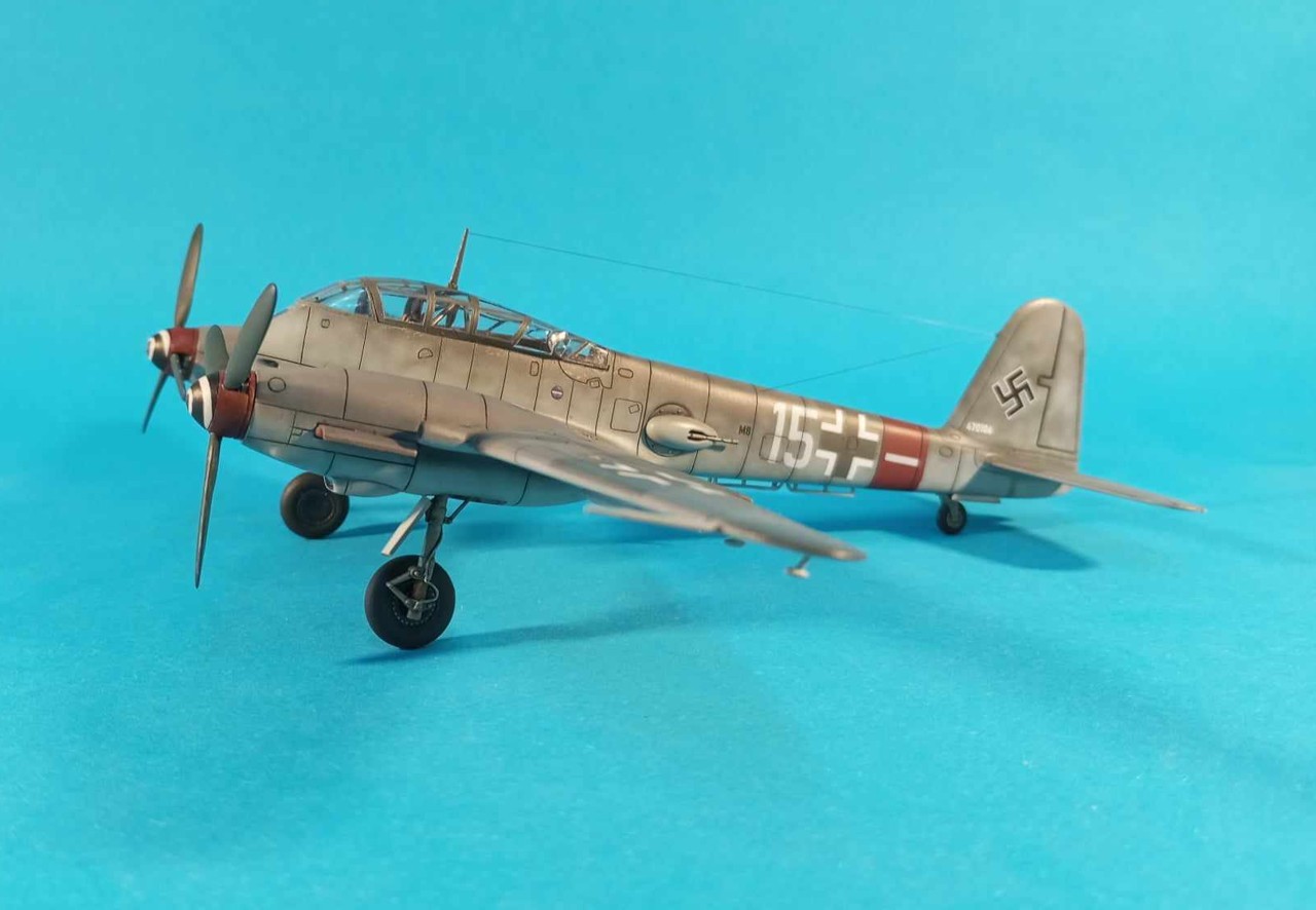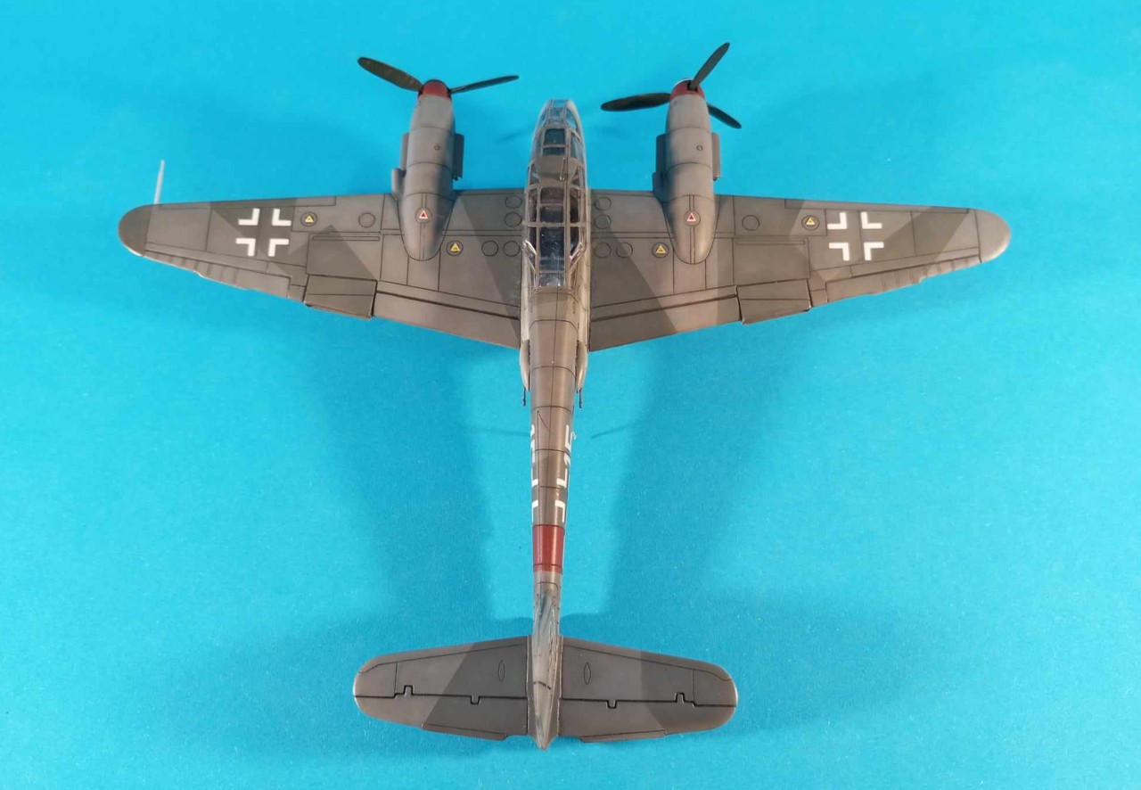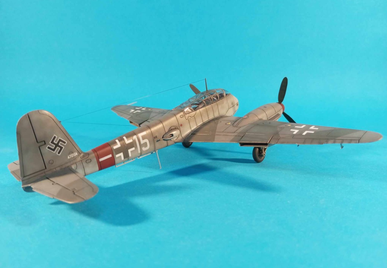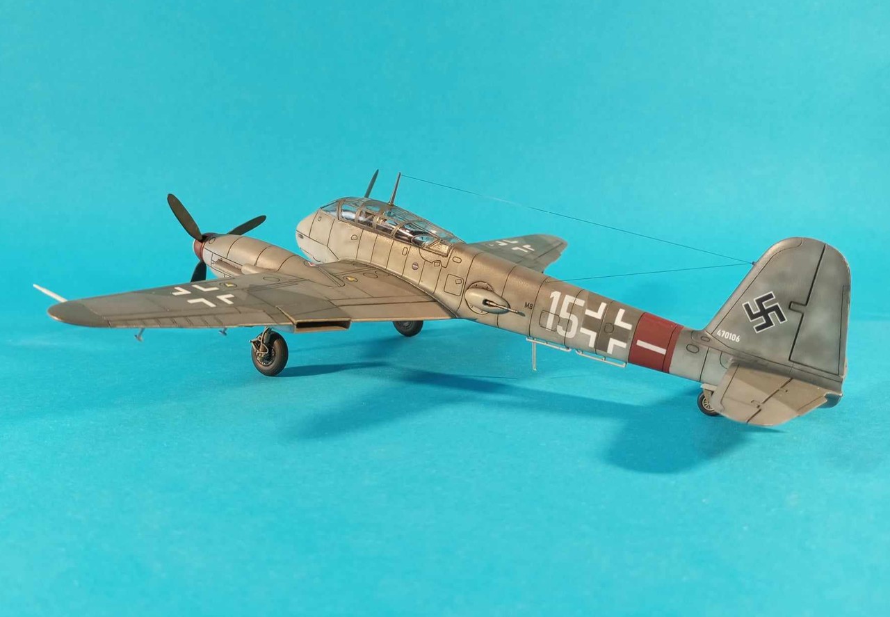 Kamufláž je rekonštrukcia podľa iných strojov z tej istej jednotky, z približne rovnakého obdobia. Farby klasika - RLM74/75/76 (Gunze H). Trupový prstenec a časť vrtuľového kužela je RLM26 - Kopferbraun (miešané od oka). Dekály sú čiastočne pôvodné (kríže), čiastočne vlastné a niečo zo zásob (svastika).