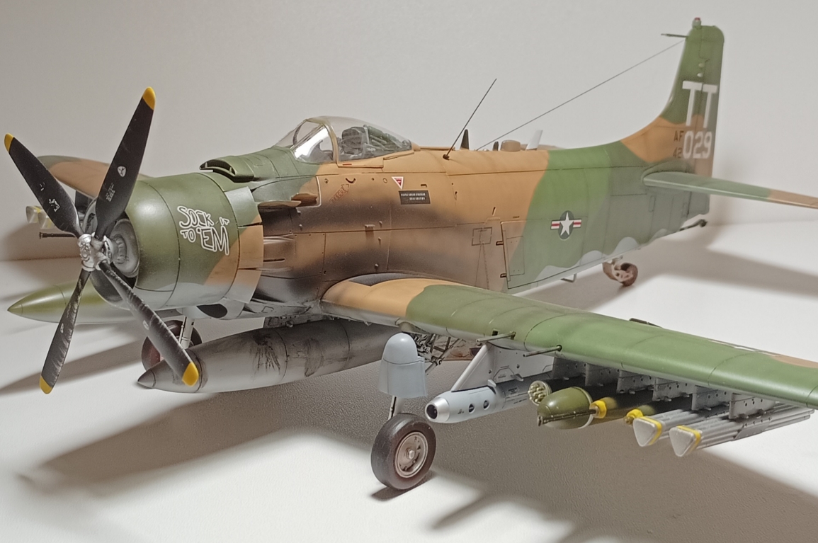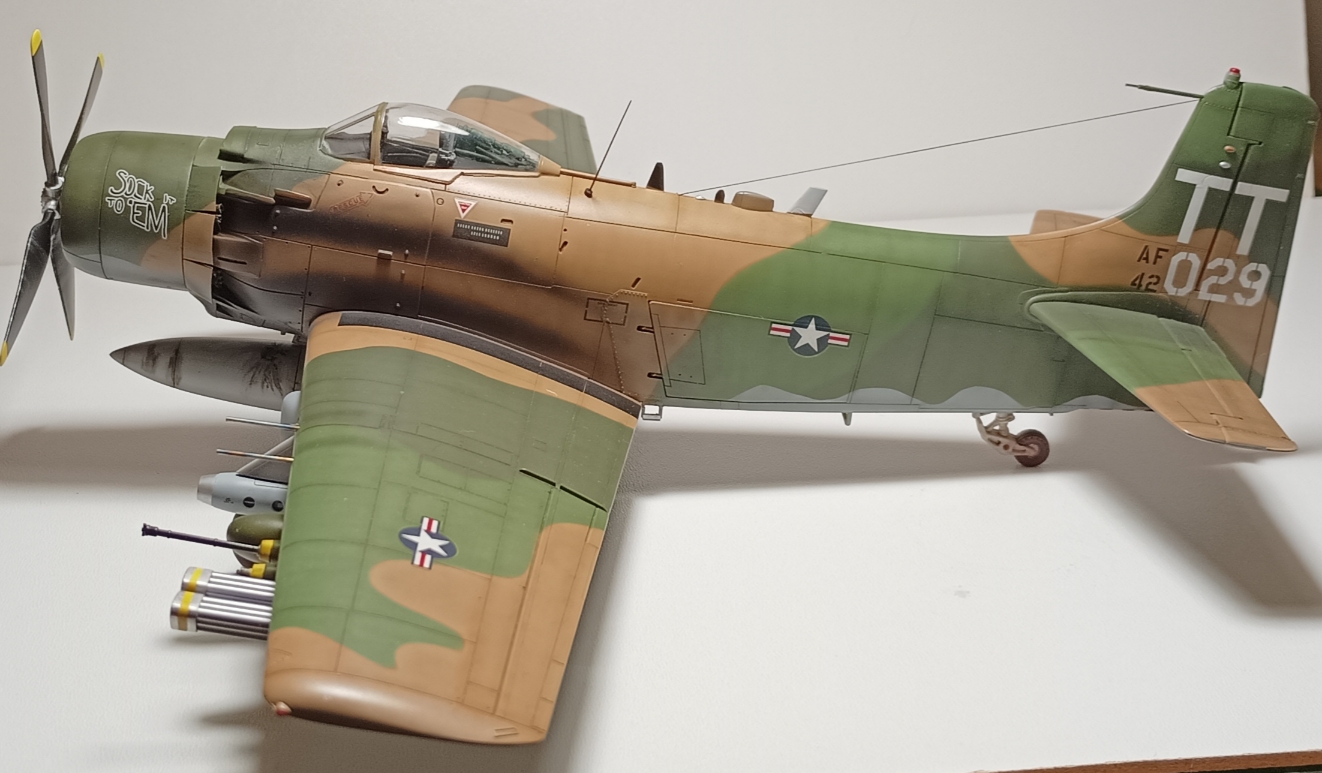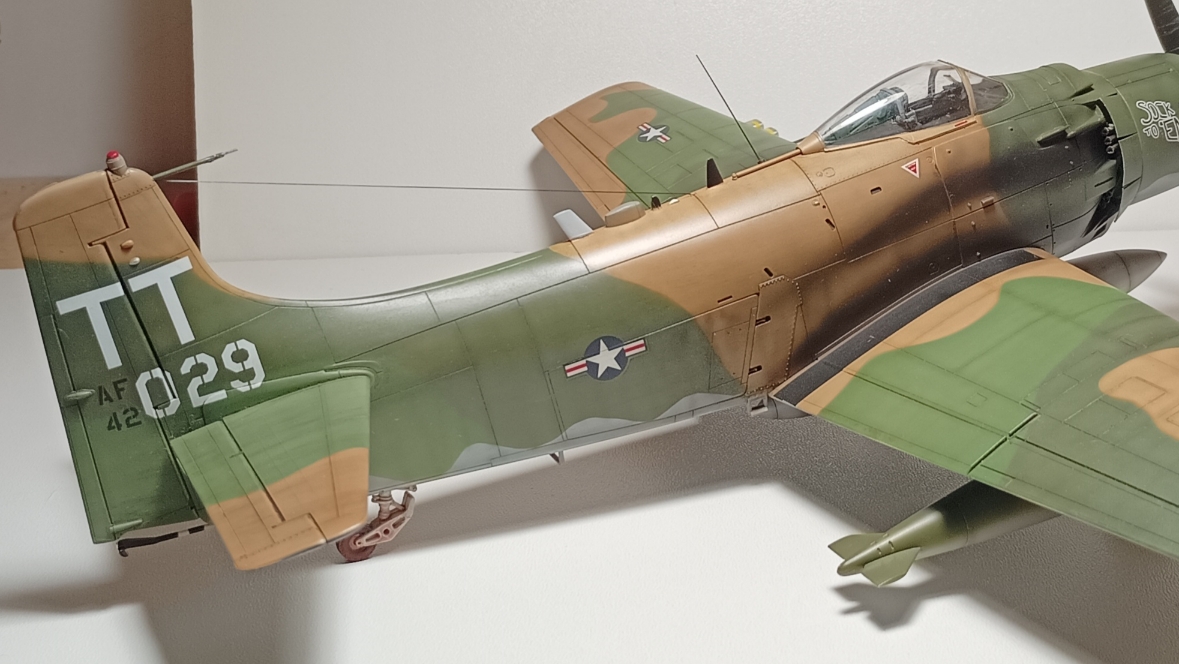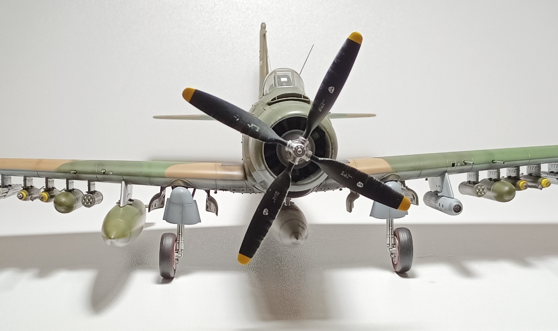 Tak cíl účasti ve skupinovce splněn. Nejvíc mě sejří zamlžená kabinka a poněkud tmavší šedá na spodku. Vrch je AK RC dark earth s bílou gunze a RLM 82/83 gunze céčko. Nějaké stíny, oleje a tak. Celkem se mi ty odstíny na SEA camo líbí.