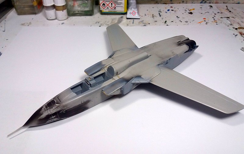 Jak vidíte, ten model potřebuje ve všech směrech vylepšit. Rytí je velejemné a poplatné době vzniku, vcelku složité sestavení vstupních kanálů k motoru končí stěnou. Trysky nejsou nic extra... no abych to shrnul, bude z toho ten vitríňáček, ale ještě nevím do které řady.