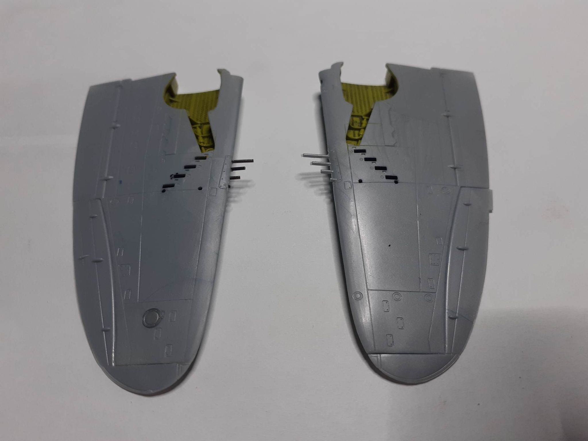 Keď som už bol včera pripravený na prilepenie krídiel k trupom, uvedomil som si, že som neurobil číre pozičky na koncoch krídiel. Tak som rýchlo prekutral svoje krabičky s "odpadom" a pohľadal kúsky čírej hmoty a dorobil tie nešťastné pozičky. Dnes ráno som potom nalepil krídla k trupom. Naposledy som lepil krídlo týmto systémom (zboku k trupu) krídlo v stavebnici MiG-21 od KP, lebo aj keď som lepil Halifaxa, tak tam boli aspoň pomocné nosníky, na ktoré som nasúval polovice krídla. Dolepil som aj vodorovné chvostové plochy a nastavil ako tak geometriu. V príspevku so zlepovaním trupu som zabudol napísať, že u trupu Razorbacku som vyrezal miesto pre šachtu ostruhového kolieska, lebo som našiel vo vrakovisku ešte jednu kompletnú šachtu z Revellu (určite pozostatok po krúžku ktorý som kedysi viedol na škole). Takže draky Thunderboltov sú hotové, najbližsie môže nasledovať nástrek primerom.