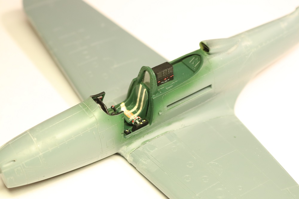Ten odstín kokpitu mi vyšel podobně, vycházel jsem z brcalove zelené, co jsem dával na vršek Zera, kterou jsem natónoval zinkochromatem.
