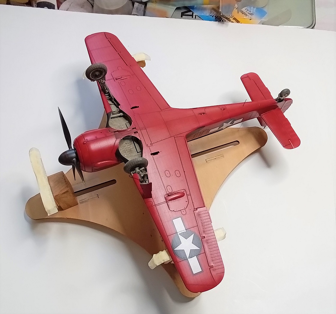 Tak pokračuji. Rychlovka mobilem. Nakonec použil wash jak červenohnědý, tak i Neutral přes znaky (přece jen červený v bílých polích znaků byl jako pěst na oko). V černé je wash ze sady na rusáky zelená+černá barva na horních plochách. Alespoň jej využiji jinak než na Jaky-1 a Finy... Na fotkách to není moc, tedy skoro vůbec znát, ale jsou tam. Kur... hodně zklamaly dekály Eduard (staré neloupací).Podkladová bílá není i pod celou modrou, ale pouze cca do do poloviny lemů a tak dělá pěkný schod. I přes několik vrstev lesklého laku je to prostě vidět.