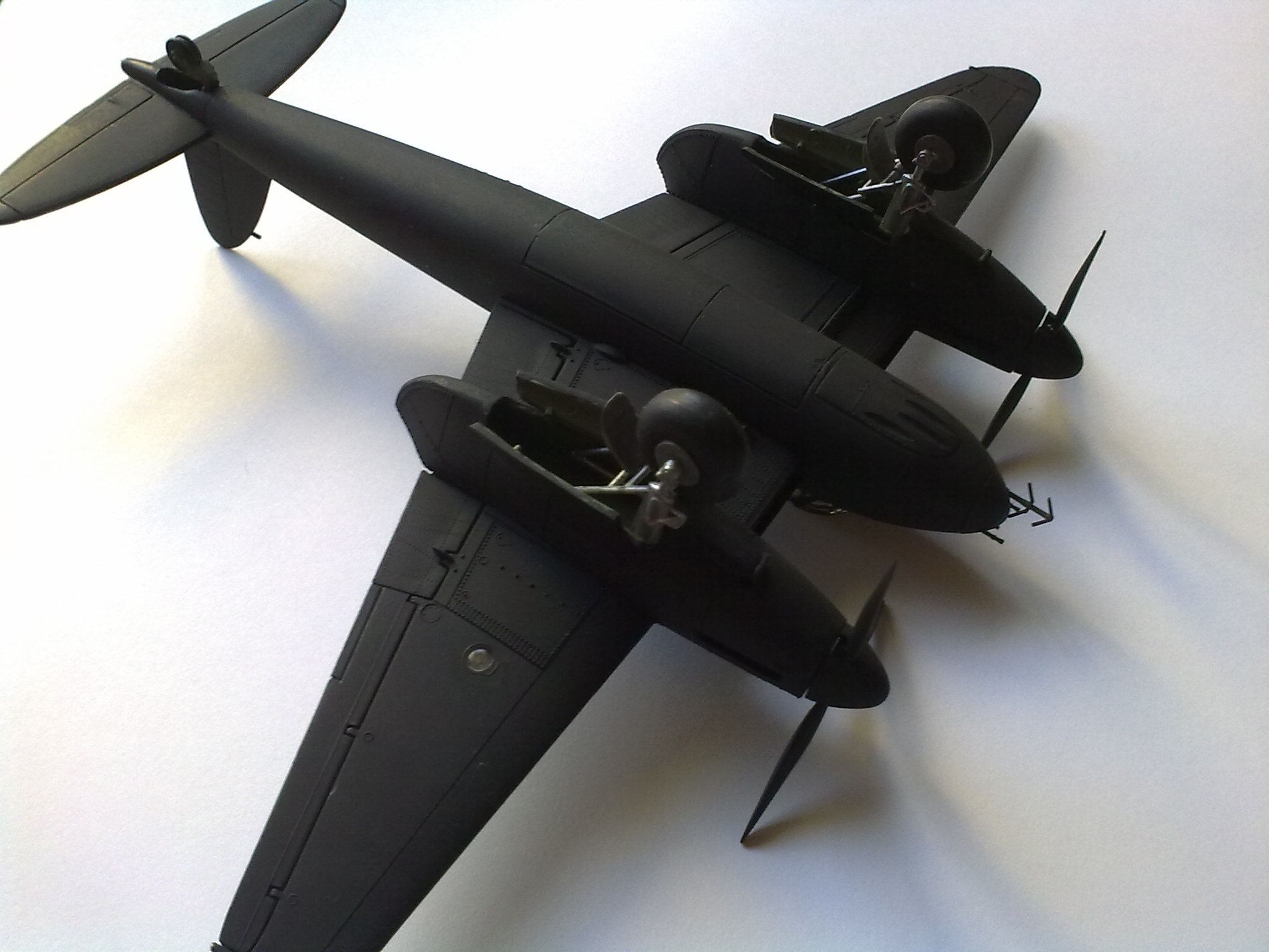 Asi som trochu neaktualizoval stavbu. Model má vytmelené gondoly, len som fotky ešte nedal. Anténa je iba jedna nalepená. Druhú som nechal nakoniec, aby som ta upresnil so situáciou. Ver mi, ak by som sa snažil lepiť podvodzok nakoniec, tak by mi ten plast popraskal. Už len pri relatívne bezpečnejšej montáži pred uzavretím gondól mi praskly obidva podvozky. Viem, ja blbec som stavebnice kúpil s vedomím že model ako model. Mosquito som kúpil za 3 € na Plastic Session, tým zodpovedá aj kvalita. Linka je vytmelená, gondoly tiež. Len som hodil fotky, a popisal trochu budúcnosť. Ospravedlňujem sa.
