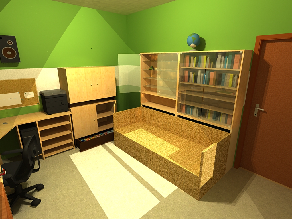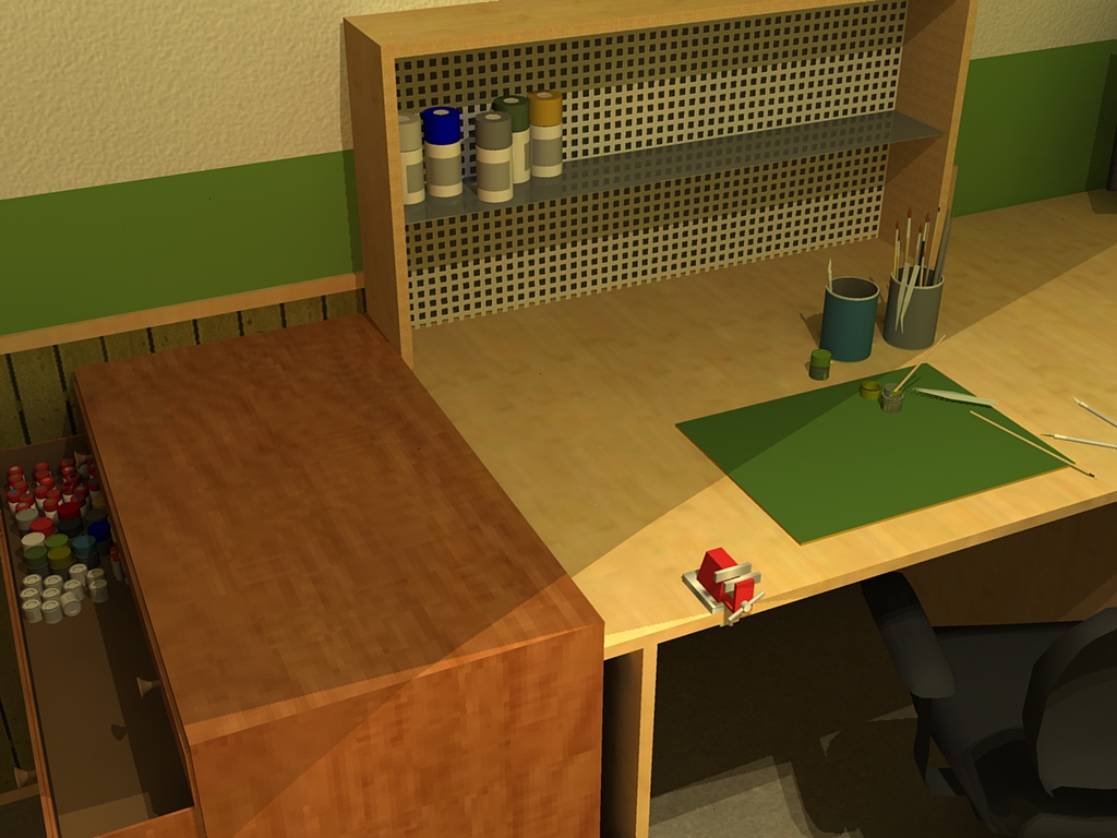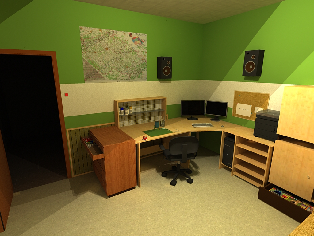 Chystám změnu: Všechno je nábytek, a příslušenství, kterým vládnu (jen druhý monitor je vroucí přání a tu poličku na stole si budu tvořit). A nejsou vymodelované dvě lampičky s pantografy...