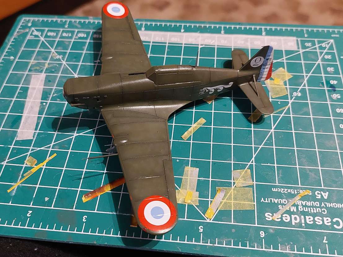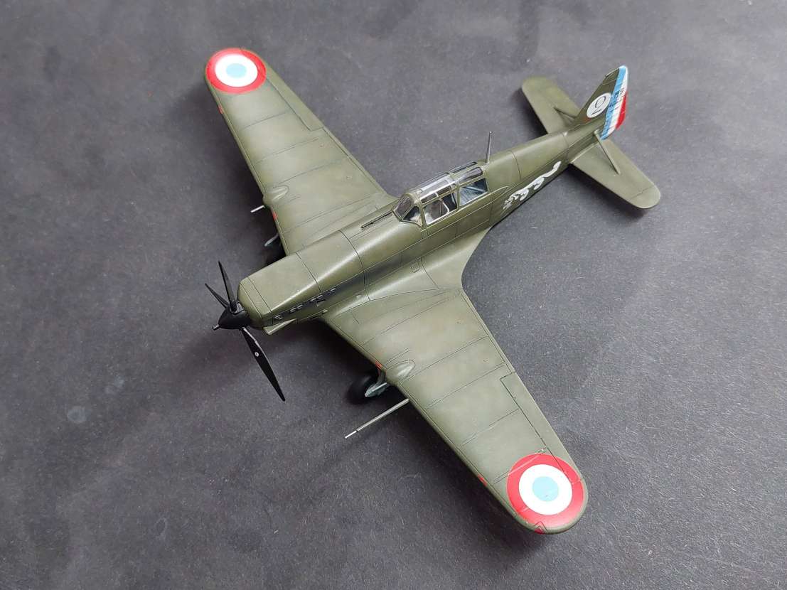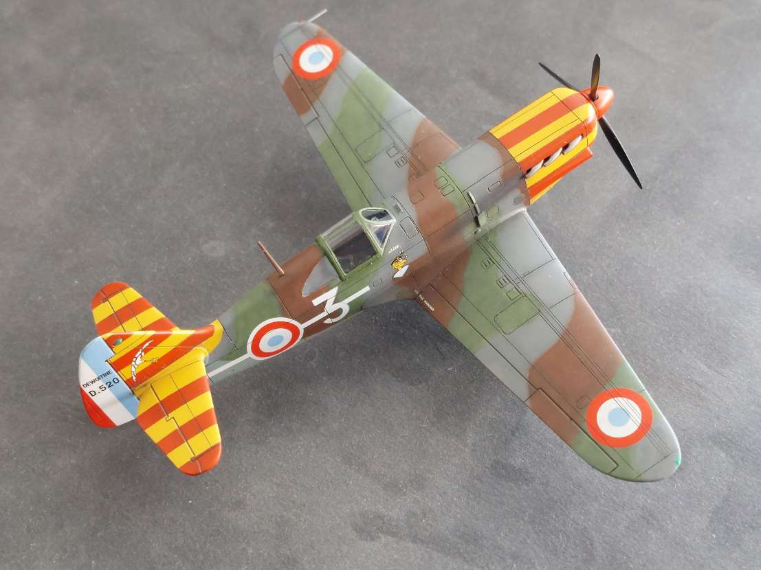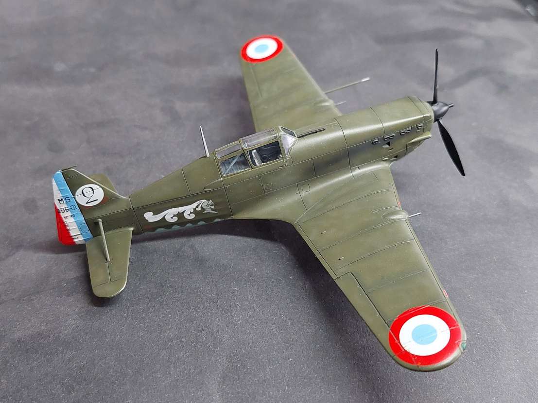 Nebaví mě wash, tak jsem se z Hurricana vrátil sem. Laborovalo se nad odstíny. U Morana jsem vzal návod H2000 a použil britskou zelenou, no na stroj z Alžírska se hodilo něco trochu světlejšího. Ale nějak mi to nešlo do kombinace se zbytkem barev pro trojbarevku. Takže u D.520 jsem dlouho uvažoval, potřebný mix který udává Dora u MB.152 jsem doma neměl. Vzpomněl jsem si na lihovou agamu, "autentický" odstíny pro Francii. No sotva jsem nafoukal první kamuflážní pole, letěla barva zpátky do lahvičky, něco tak jedovatýho bych použil možná tak na bronzovou střechu kostela nebo vyblitou Mi-4 z Vyškova. Tak jsem nakonec vzal něco zelenějšího od gunze a výsledek je na fotce. Je to takové asi taky mimo, takové živé, ale už to nechám.
