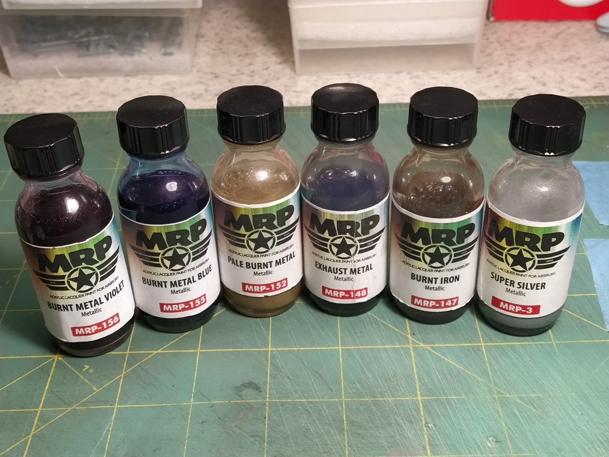 Co se týče použitých barev, na trysky jsem používal MRP viz obrázek: Na kamufláž jsem pak používal MRP196, MRP198 a Gunze C331. A pak na vrcholky SOP, náběžky a různé dielektrické krytky C073 a C047.