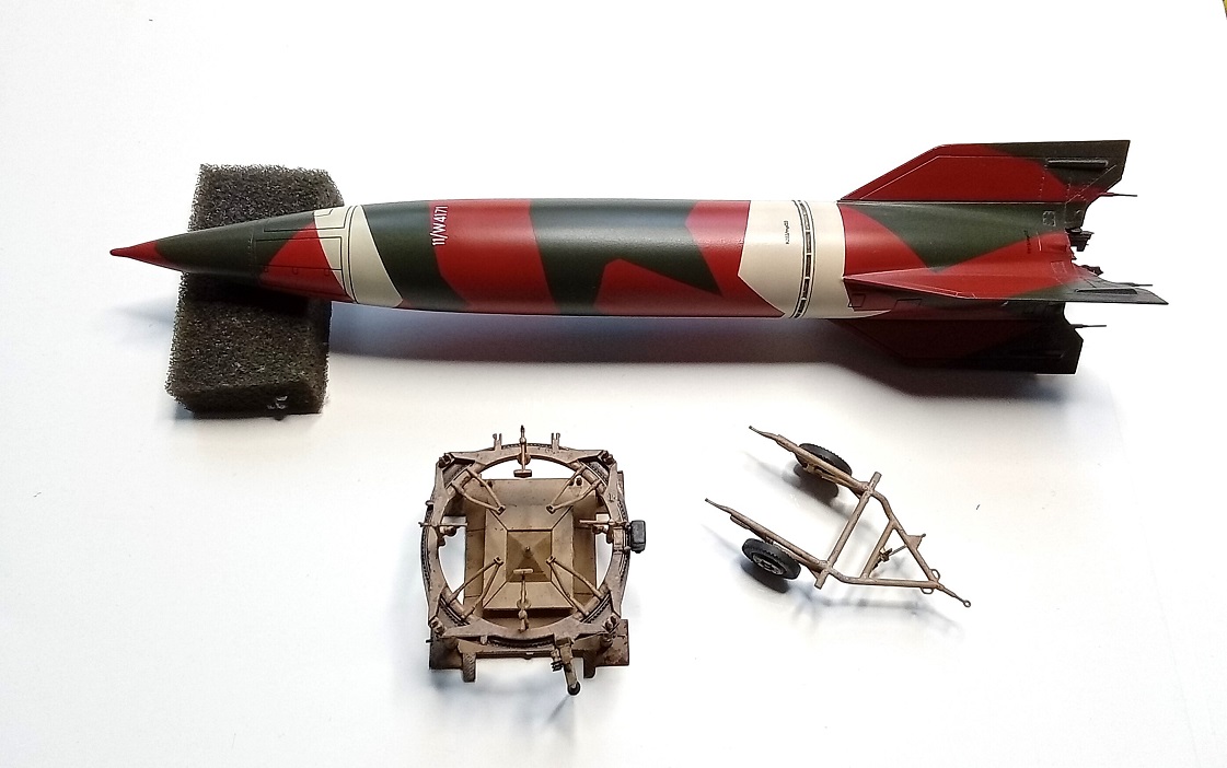 A4/V2 prototyp, 1:72 Special Armour. Model jsem získal bez krabky, návodu a dekálů. Tím bylo limitováno zbarvení. 3 kamo v bíločerném zbarvení mají na trupu mezi kormidly obrázky, např. čarodějnice, žena na Měsíci, atlet. Pouze 4tá střela nese zbarvení bez obrázků a to kombinace prototypů a olivové RAL6003 jako sériové kusy.