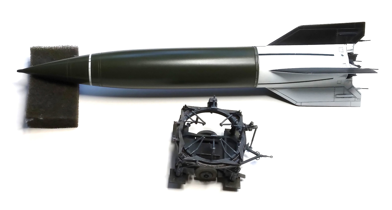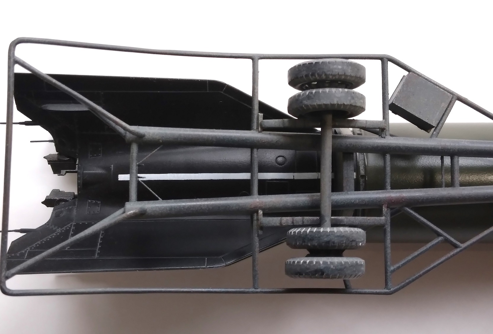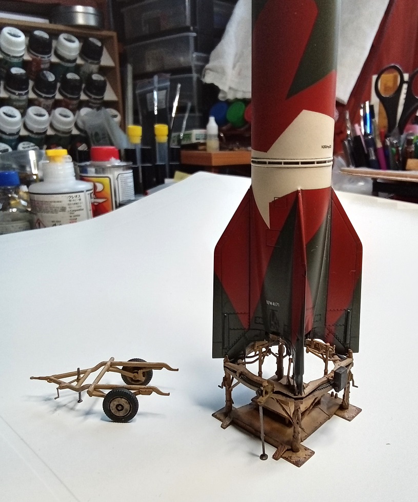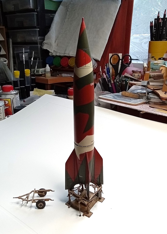 Doděláno metodou ŽÁVES (Žádný Velký Xraní) ... Podklady na to nejsou, našel jsem jedinou fotku zepředu. Model jsem potřeboval pod A4/V2, kdy jsem chtěl startovací stolici v přepravní poloze a řešil jsem kam s rachejtlí. Největší zdržovačka byla se začištěním trubkové konstrukce a hlavně s koly, které jsem měl přesazené skoro o 0,5 mm. Takže ve výsledku jsou na průměru menší než by měly být, já to vím, nyní i Vy, ale to je tak všechno, co s nimi chci dělat ...