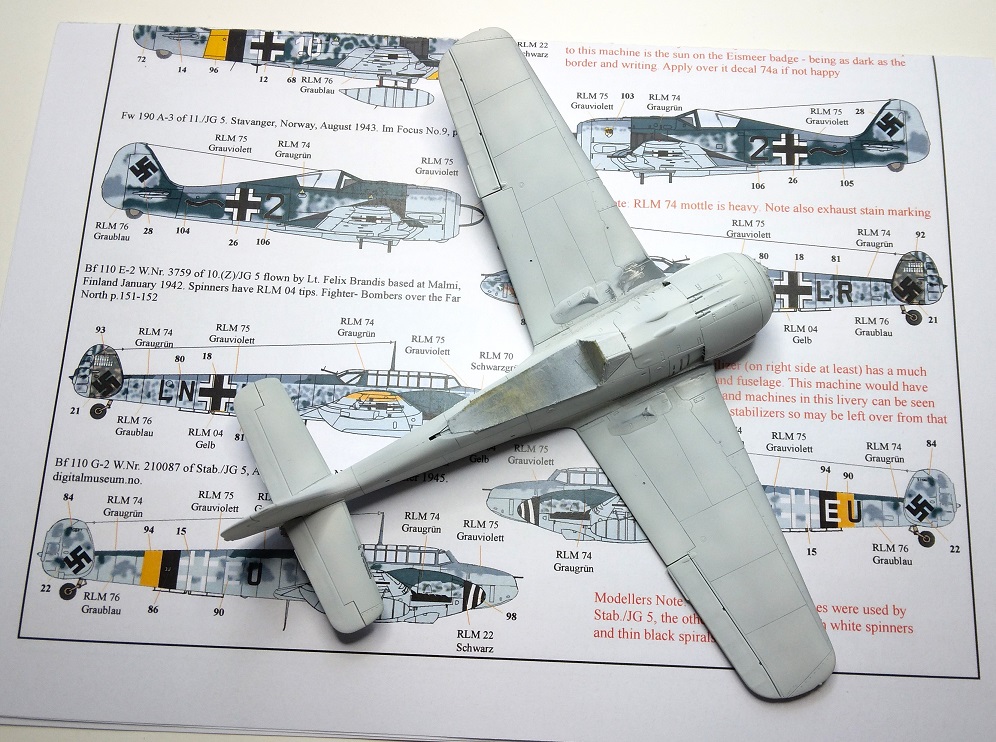 dekály Tally Ho! udávají RLM 70, 75, 76. Předpokládám, i vzhledem k době vydání dekálů, že autor vycházel z časopisu "maketorama" z roku 1999. Dekály přesně odpovídají, odpovídá i kamo, např. fleky na mot. krytu apod. A protože nemám fotku (stejně bych barevné odstíny na černobílé fotce nepoznal