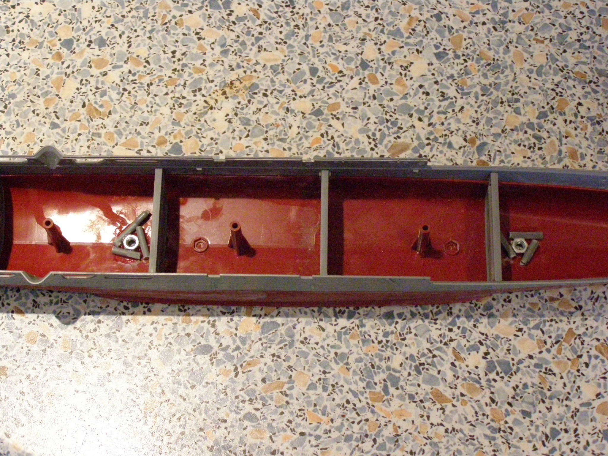 Pomalu pokračuju dál, vlepil jsem všechny matky obsažené ve stavebnici a zároveň jsem navrtal dno a vlepil matice pro pozdější uchycení modelu k podložce. Jinak už mám i nalepené díly paluby a nahrubo zatmeleno.