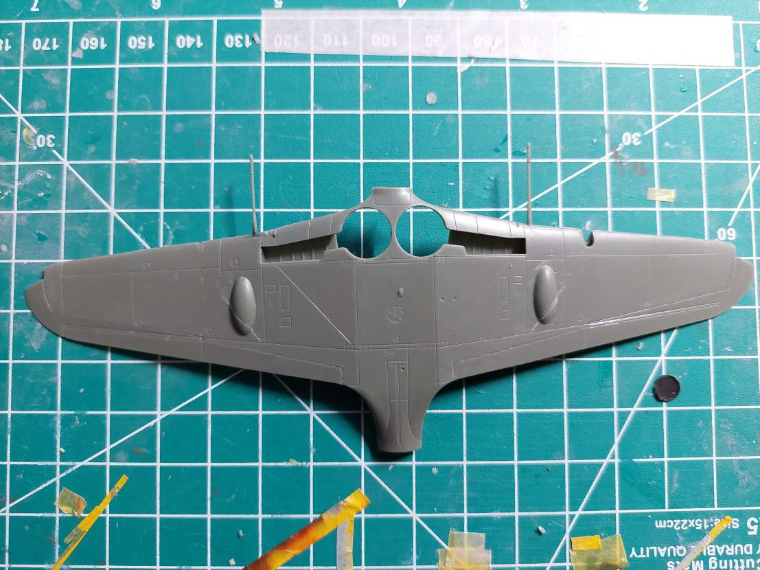 Tak když už mám namíchané ty odstíny, zpracuju i toto. Jak to v krabičce vypadá hezky, tak jsem od toho čekal víc. Zatím jen slepeny křídla. Vybrání pro vlepení kanonů asi poloviční oproti jejich síle, nahrubo jsem vydlabal prostor, díru dotmelim. Dělení křídla mimo paneláž, taky super. Ostatně s tou paneláží jsou asi dost na štíru, ale nehodlám se v tom víc hrabat. Vespod to zatmelim a doryju linky k linii křidélek jako to je nahoře. I oproti kresbám kamufláže ta paneláž dost neodpovídá, skoro si říkám jestli to není nějaká spatlanina verzí dohromady a doryj/zatmel dle potřeby. Ani otvory pro vyhazování nábojnic nebyli schopni udělat zahloubený.