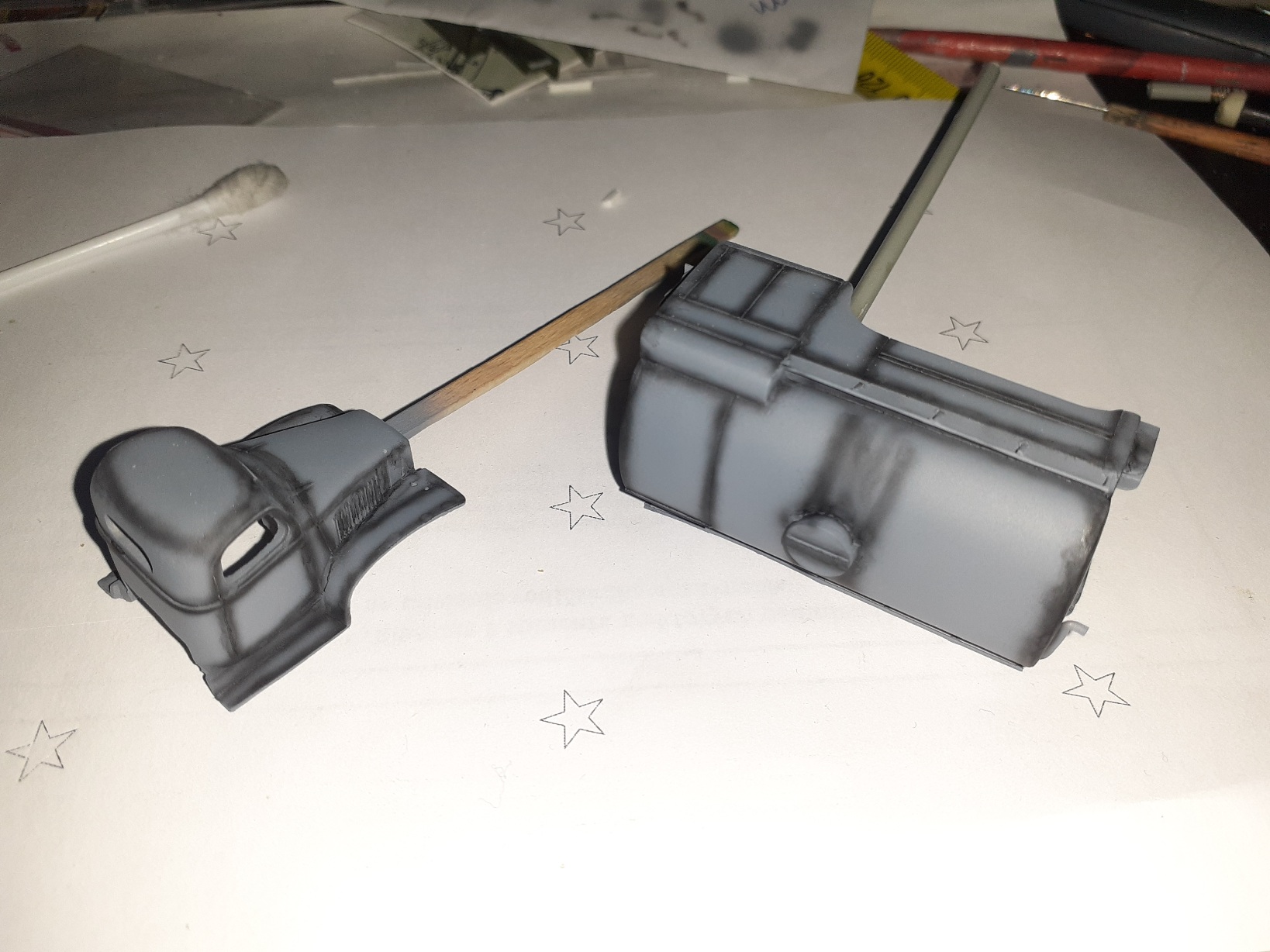 Aby nebolo, že som sa aj tu zasekol, tak cisternová Džímsa bola streknutá primerom One Shot od Ammo a prešejding čiernou Tamiyou. Okrem toho som ešte začistil kolesá na cisternu - nudná a nekonečná "zábava".