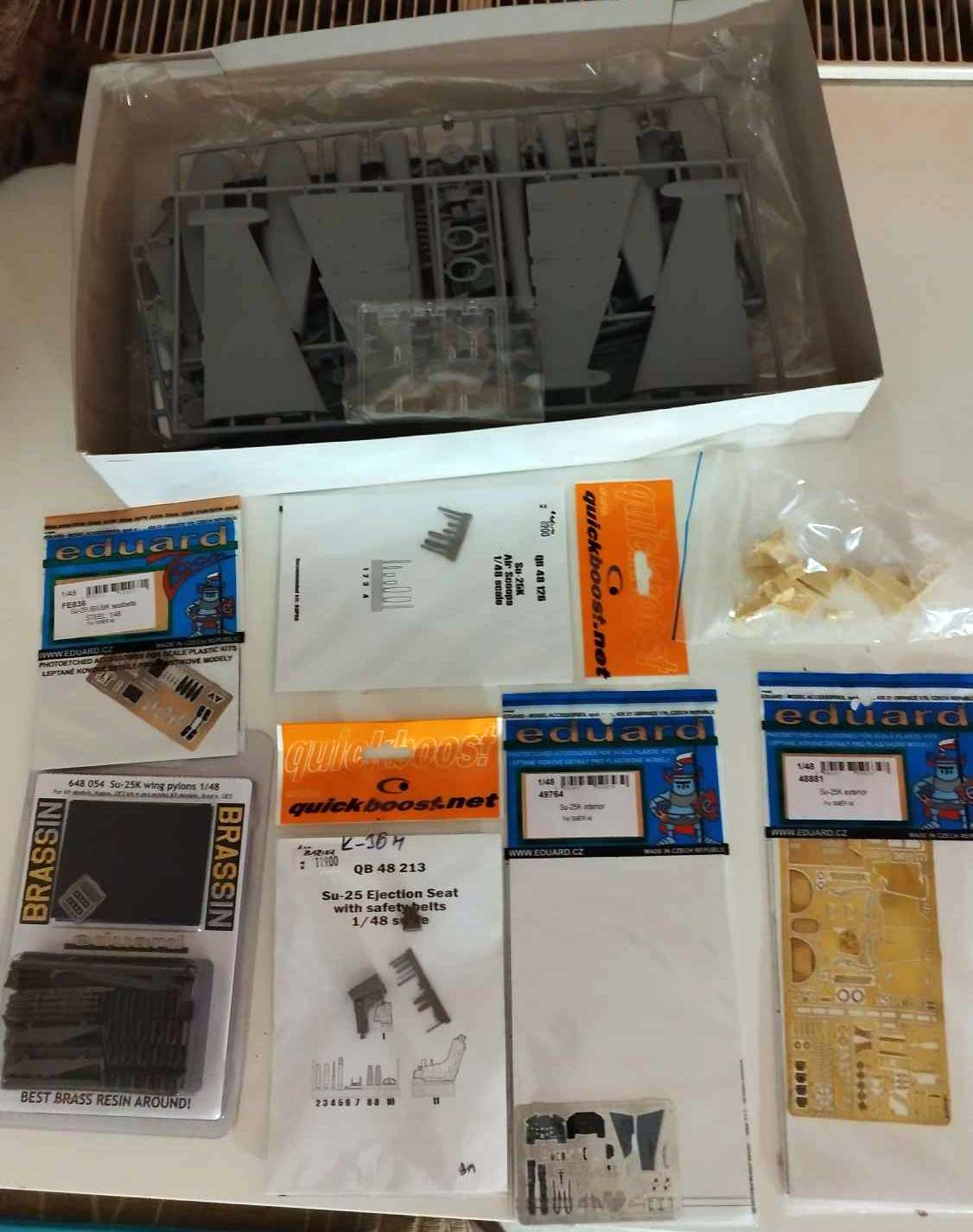 Při prohrabávání kitníkem na mě vypadla bílá krabice s rukou psaným nápisem Su-25K. Obsahovala nejen (nepřekvapivě) světlešedé výlisky čtvrtkového Su-25K (ex OEZ) bez návodu a dekálů, které jsem kdesi kdysi levně koupil, ale i spoustu doplňků...