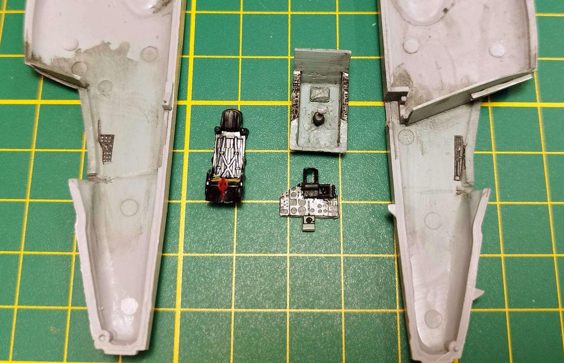 První pokrok stavby - kokpit 8-) Základ resin Pavla doplněný plechy Eduard, Sedačka Quickboost s odbroušenými pásy. nahrazenými lepty Eduard (tenhle postup je pro mě jednodušší než vybarvovat třesoucí se rukou resinové pásy).