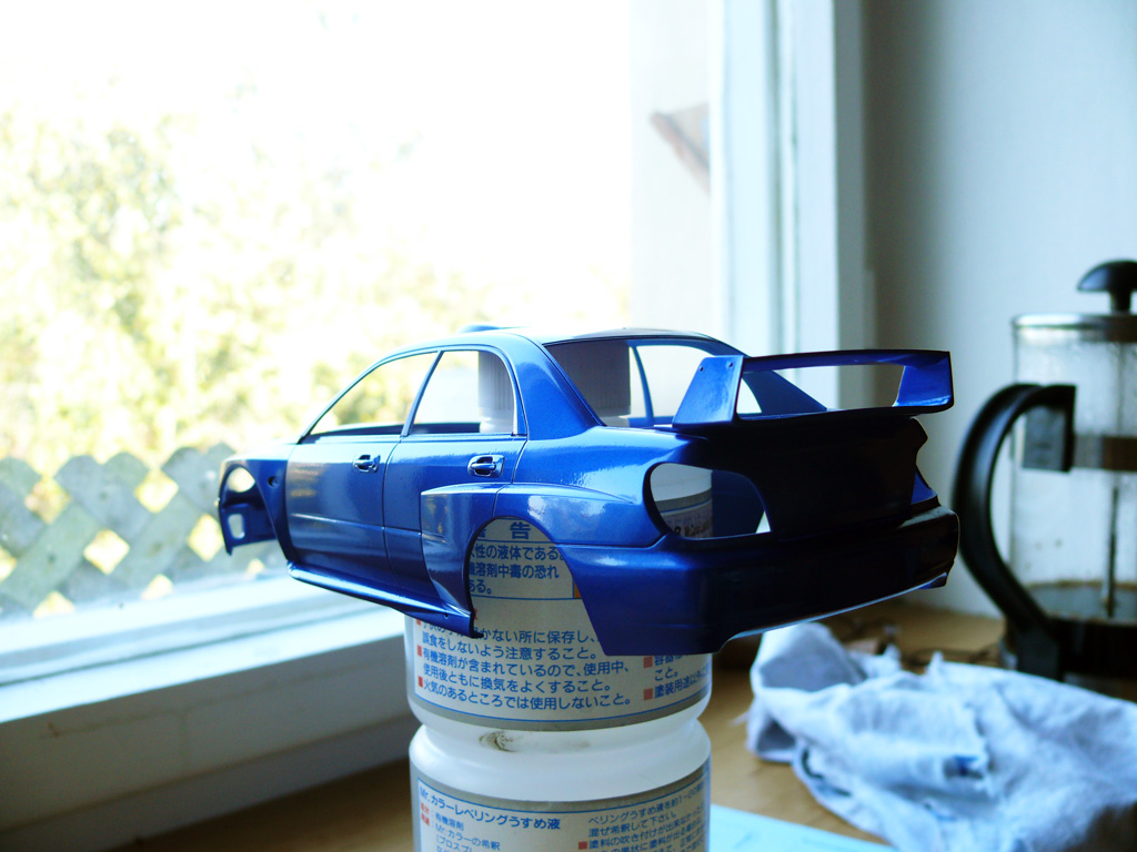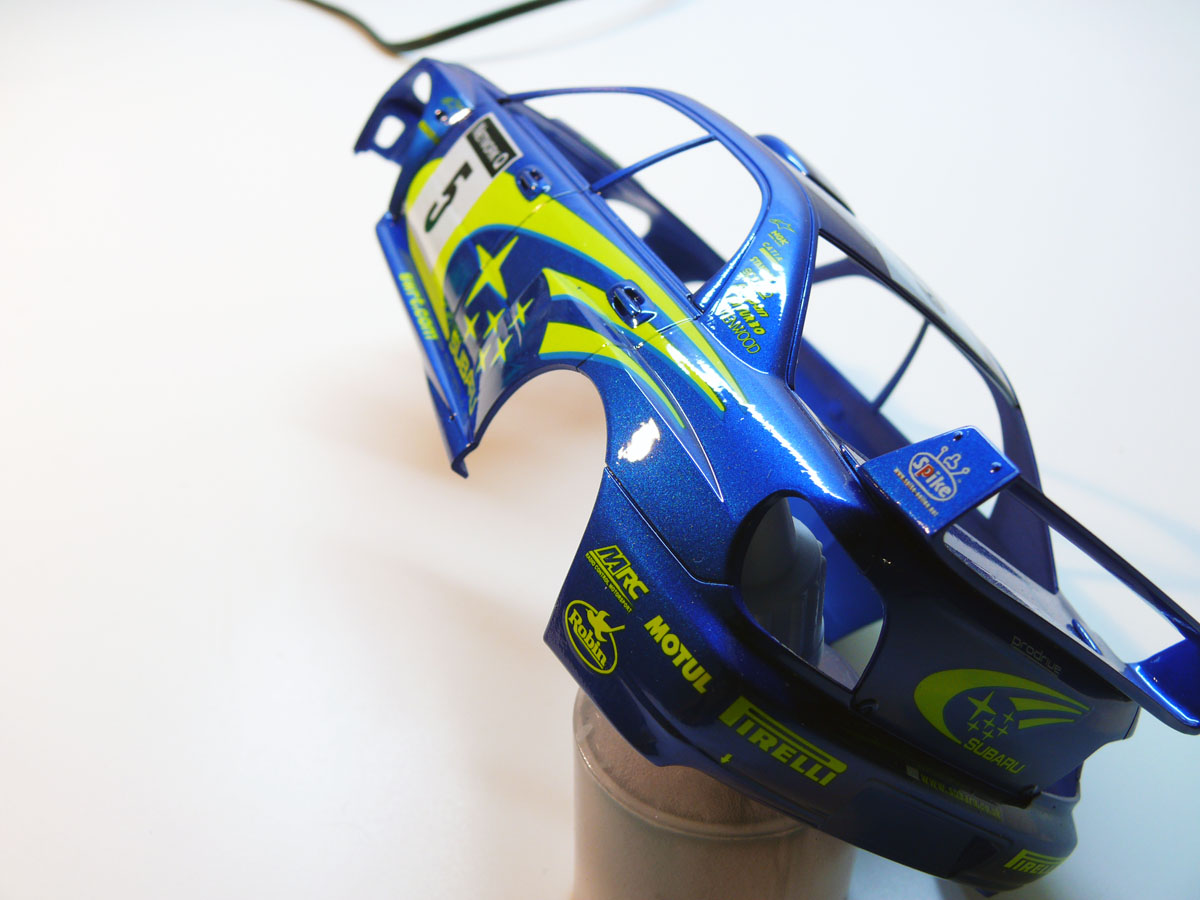 Tady je postup na tlumičích - přední budou trochu zmáčknutý a zadní malinko vysunutý: Další byla na řadě kastle - v barvě Zero Paints pro Imprezu - po prvních vrsvách laku (ještě ne 2K):