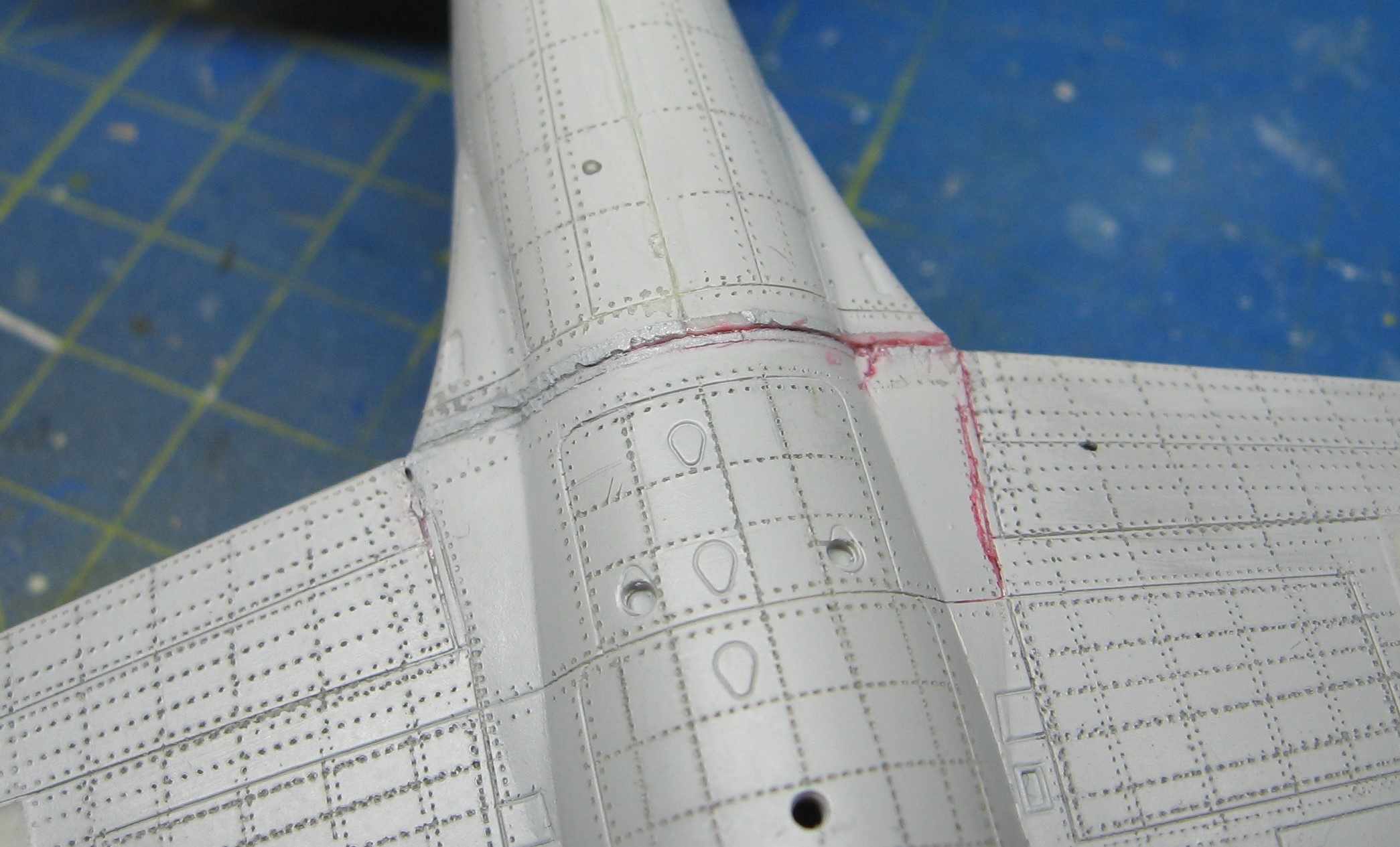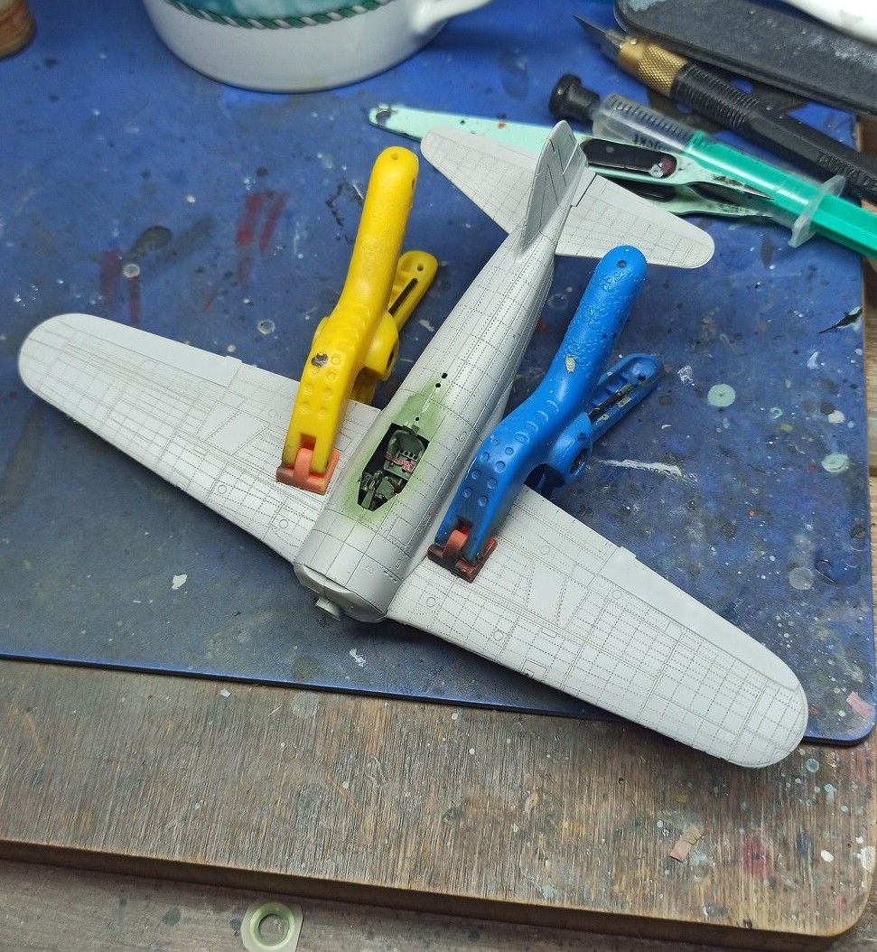 No nějak mi zaspadl kokpit do trupu a ten nešel rozlepit, a spíš jsem už malem ulomíl křídla. Nedavno sem si tedy koupil novou stavebnici jako náhradu a najednou mi křídlo samo odpadlo samo. Takže sem tedy tek kokpit nalepil zpět, a křídlo znovu usadil. Bohužel dolování na něm je znat, ale myslím, že ten schod nějak už vyřeším.